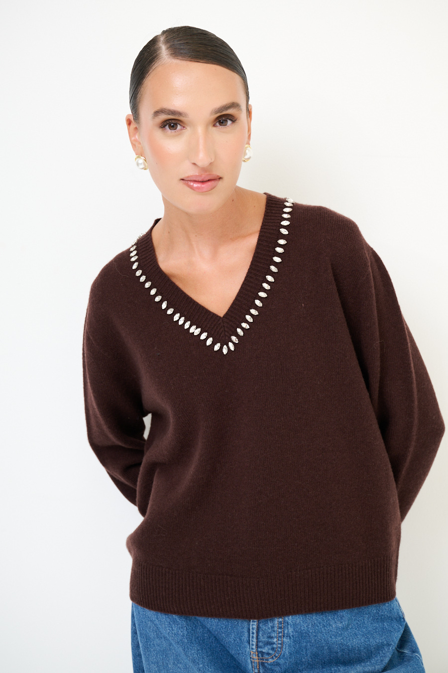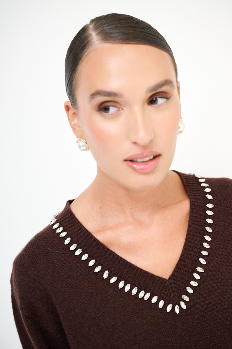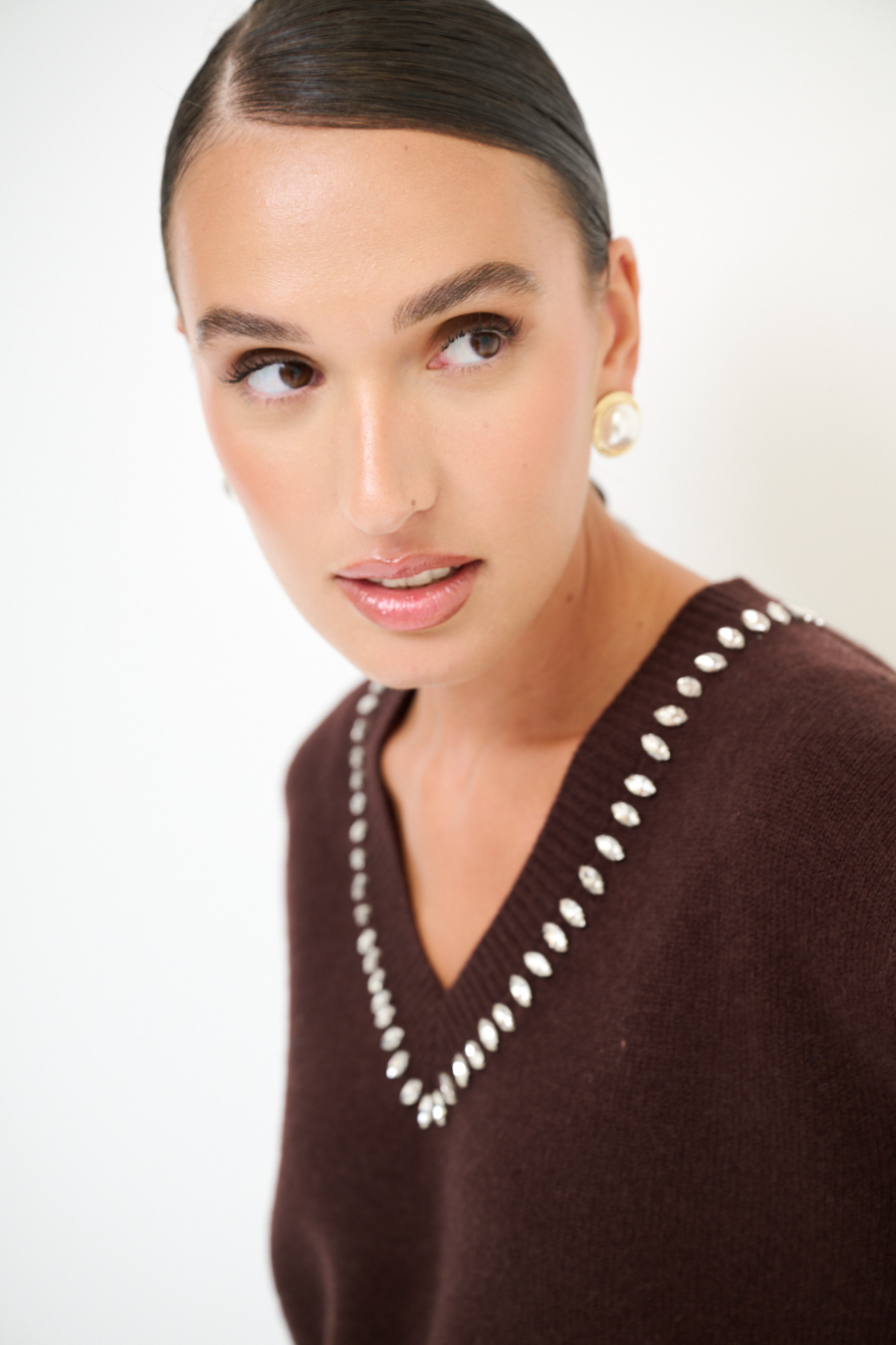 MAGLIA SCOLLO V STRASS LANA CACHEMIRE COFFEE