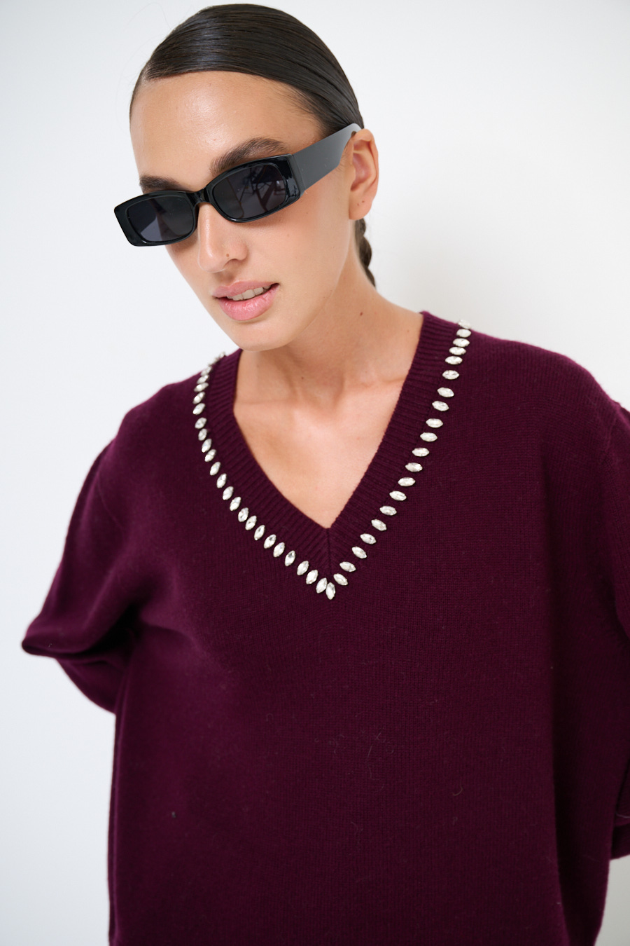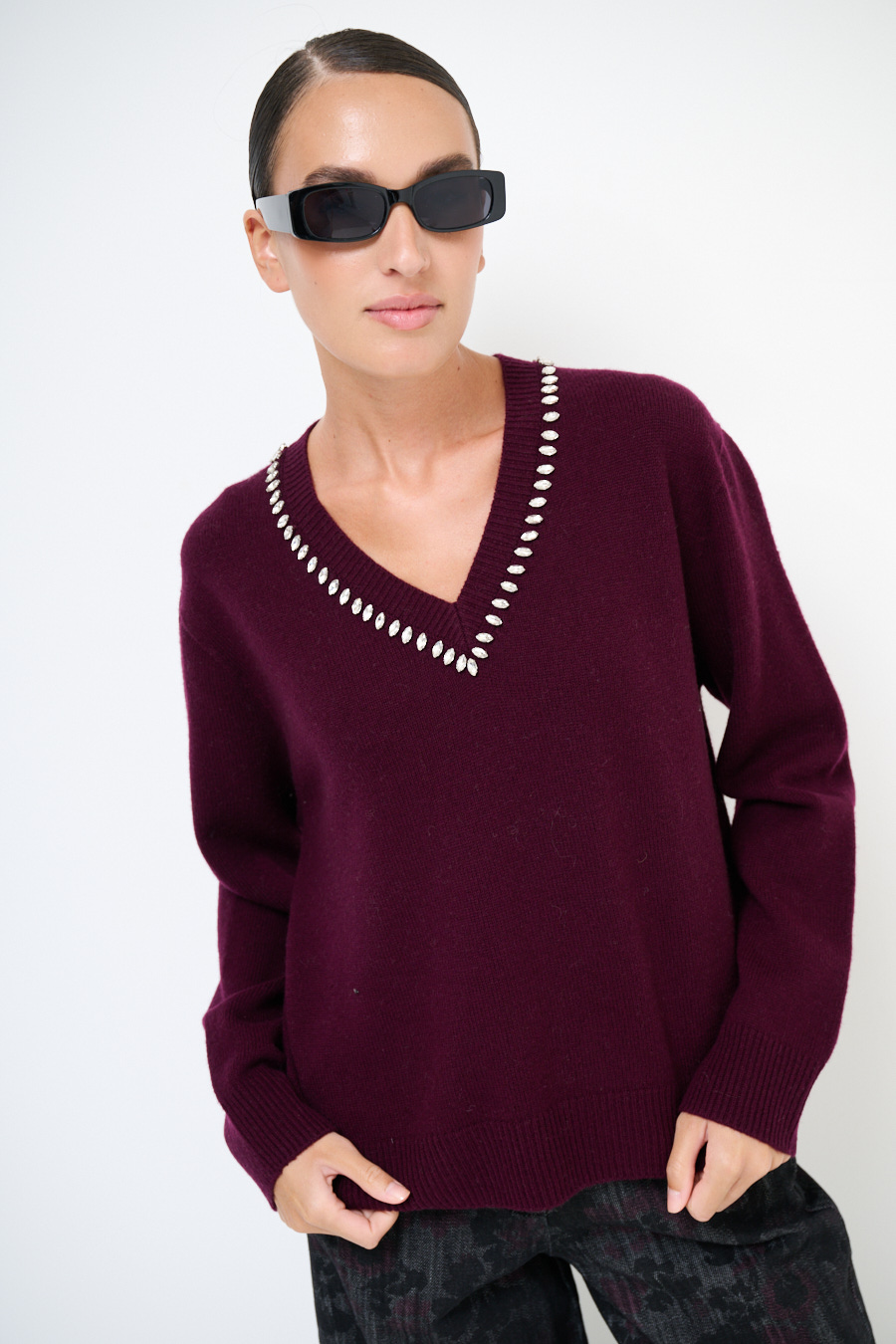 MAGLIA SCOLLO V STRASS LANA CACHEMIRE VINO