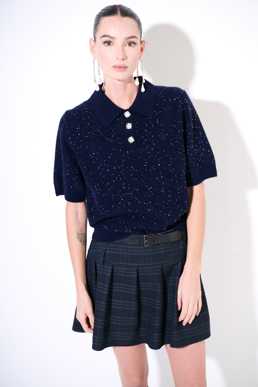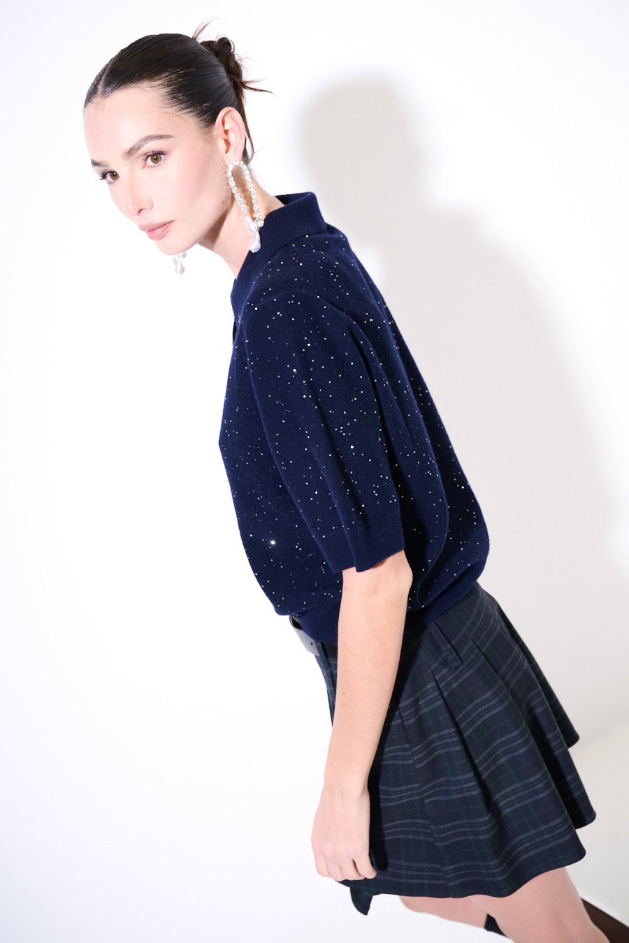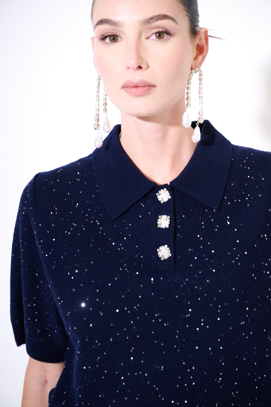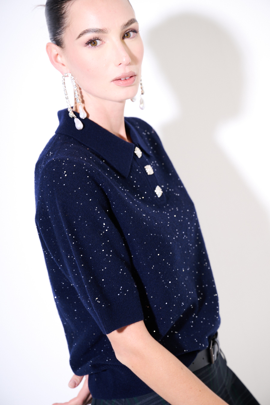 Maglia polo a mezzamanica con colletto e micropaillettes, in misto cashmere.