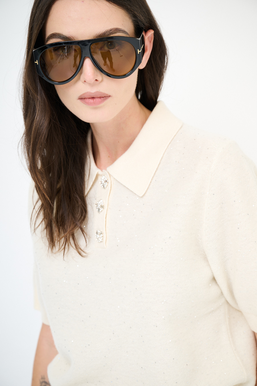 Maglia polo a mezzamanica con colletto e micropaillettes, in misto cashmere.