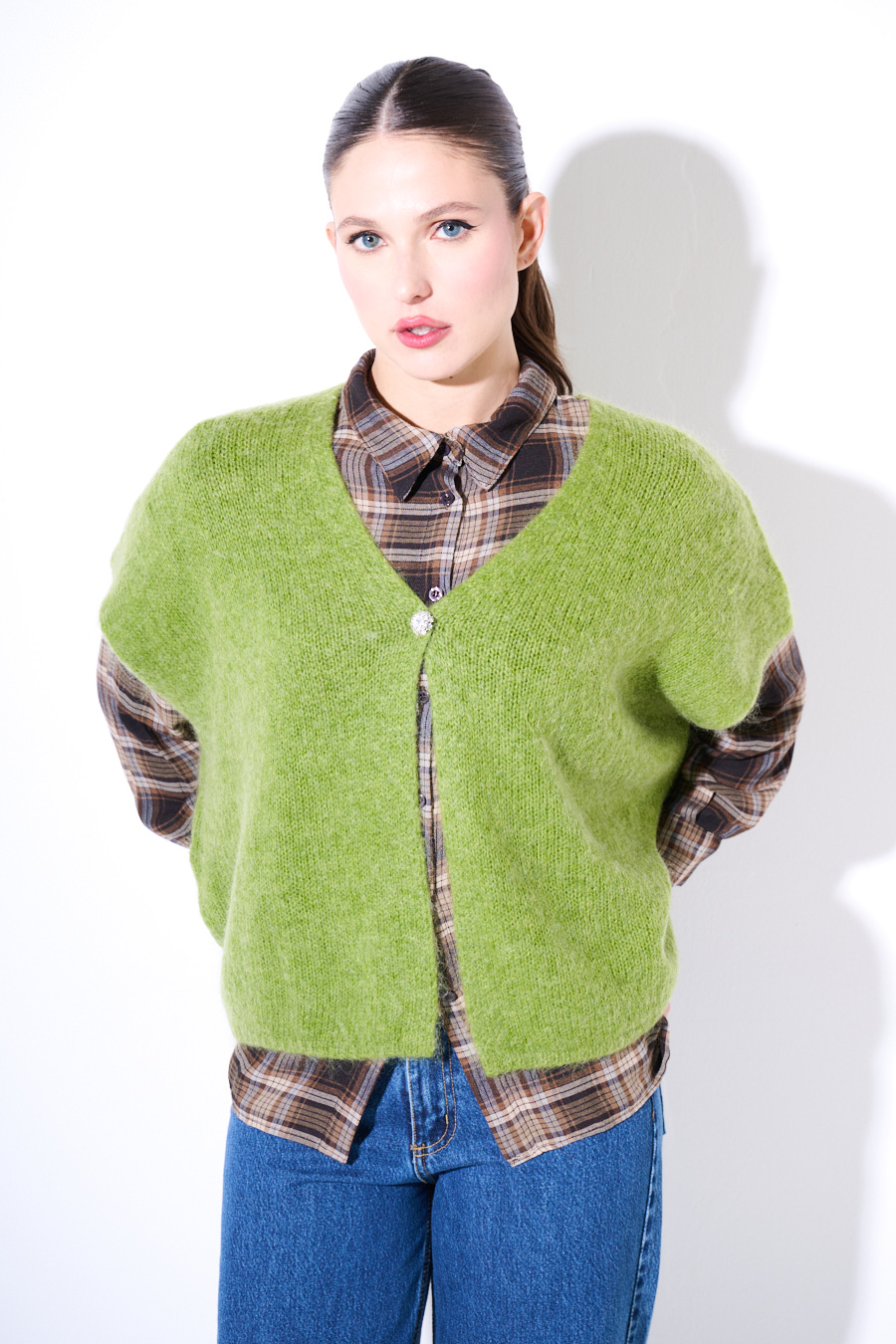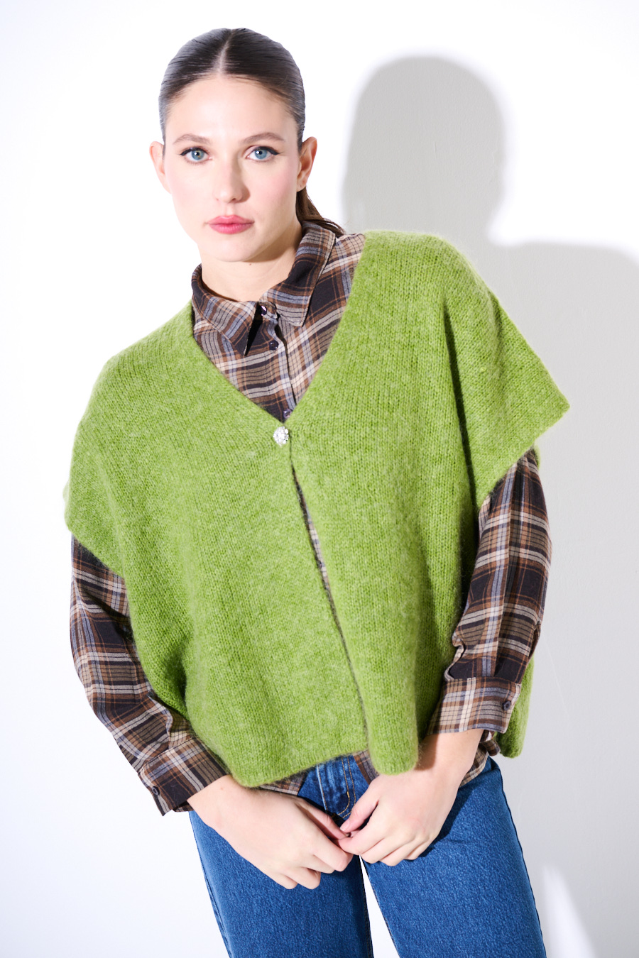 Poncho smanicato in misto mohair con scollo a v e con un bottone gioiello.
