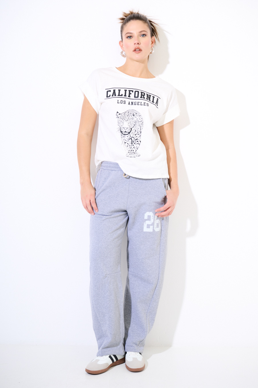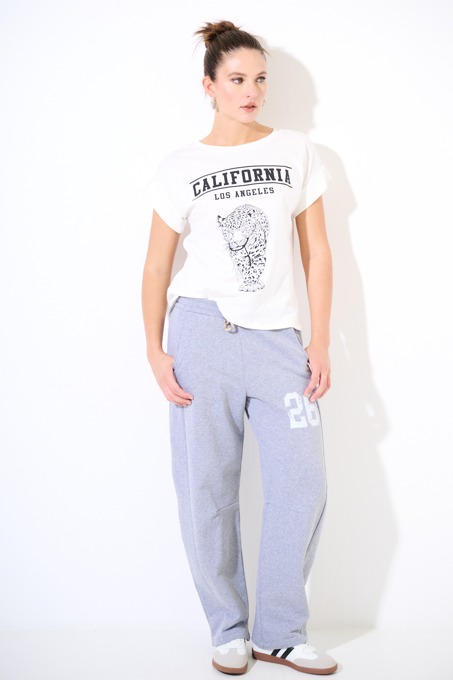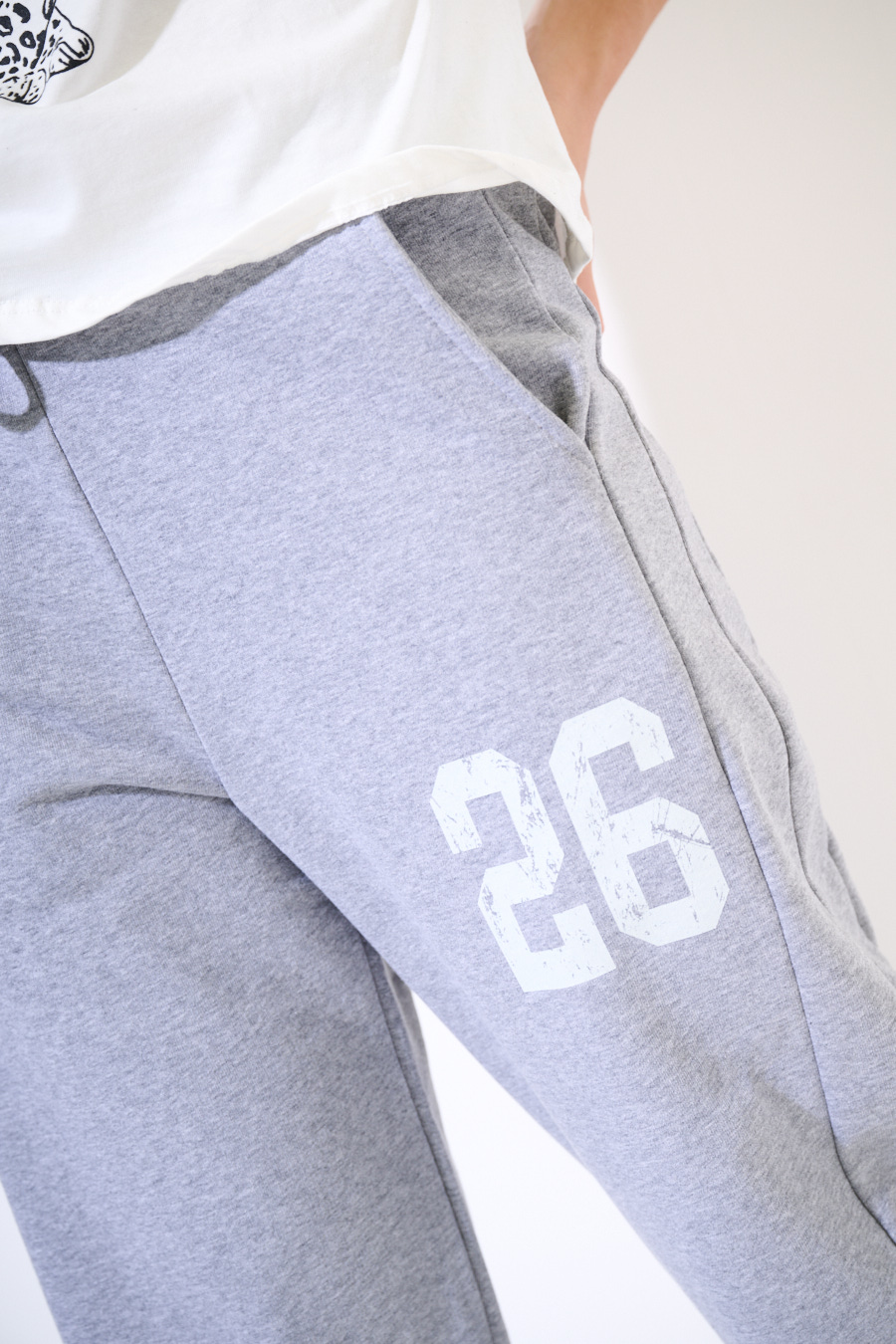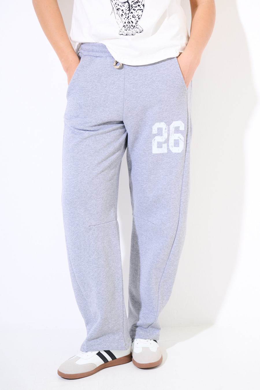 Pantalone balloon in felpa garzata con coulisse in vita e tsmpa numero sul lato.