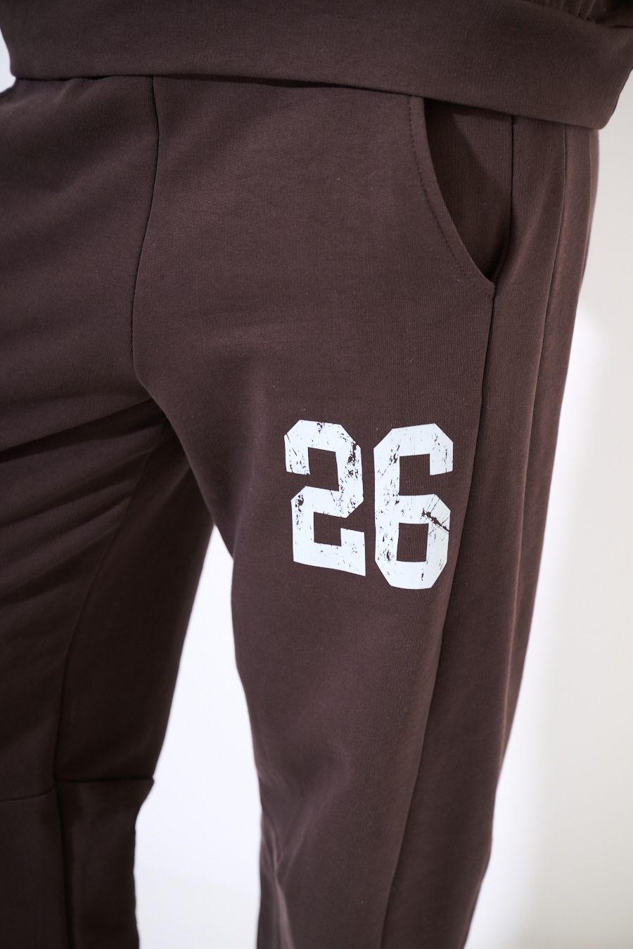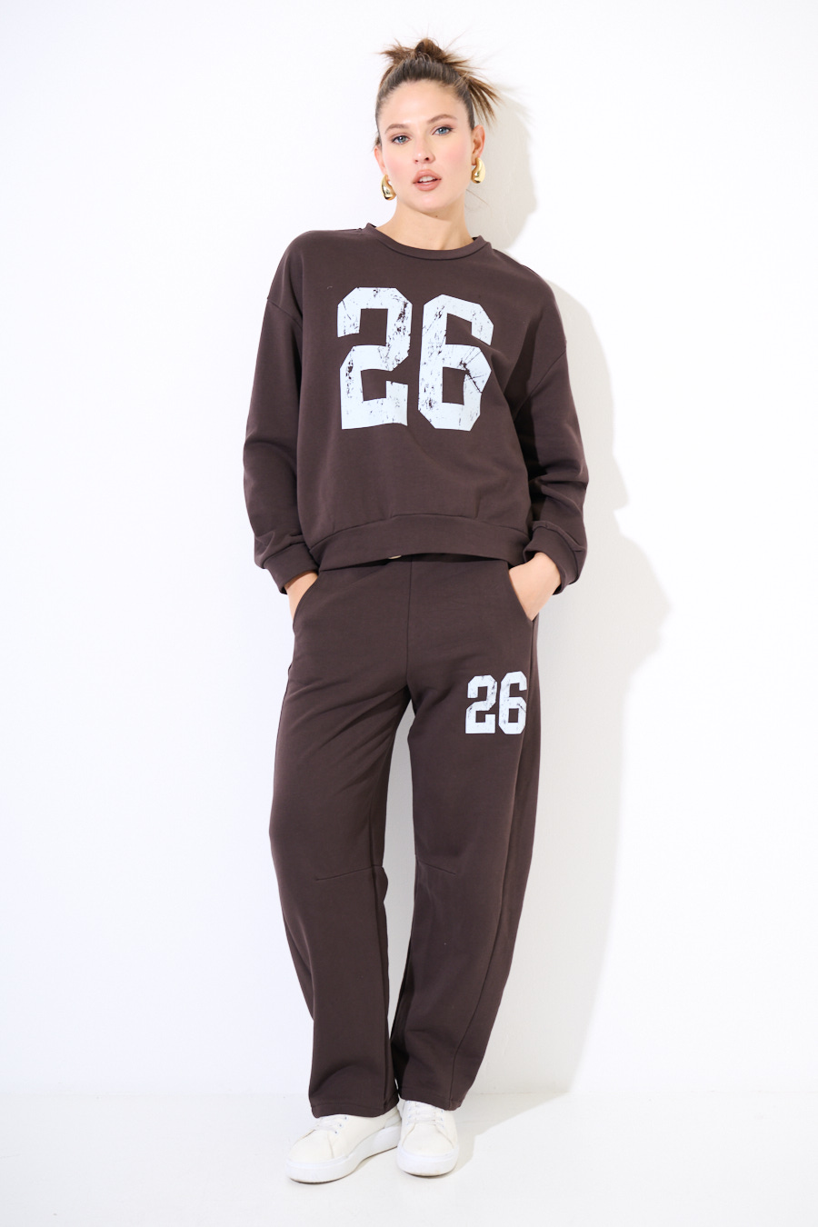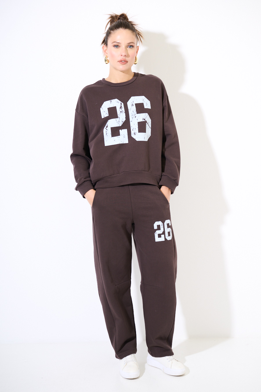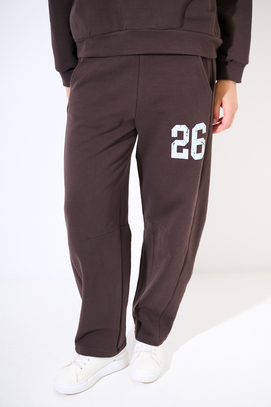 Pantalone balloon in felpa garzata con coulisse in vita e tsmpa numero sul lato.