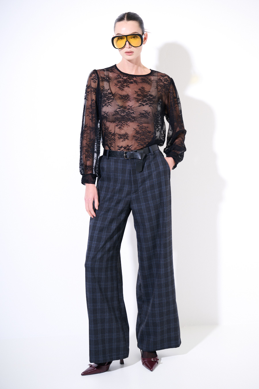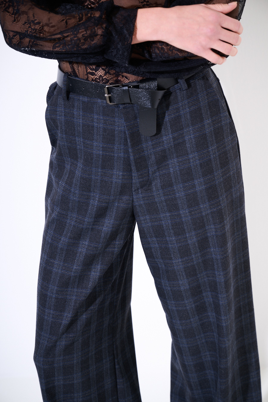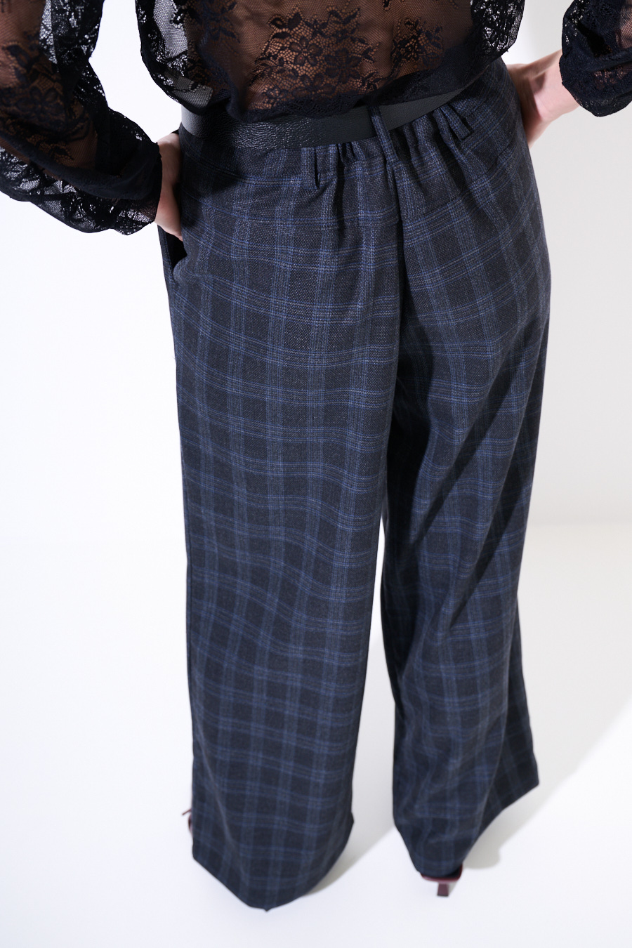 Pantalone ampio a palazzo a quadri con tasche e cintura in vita.