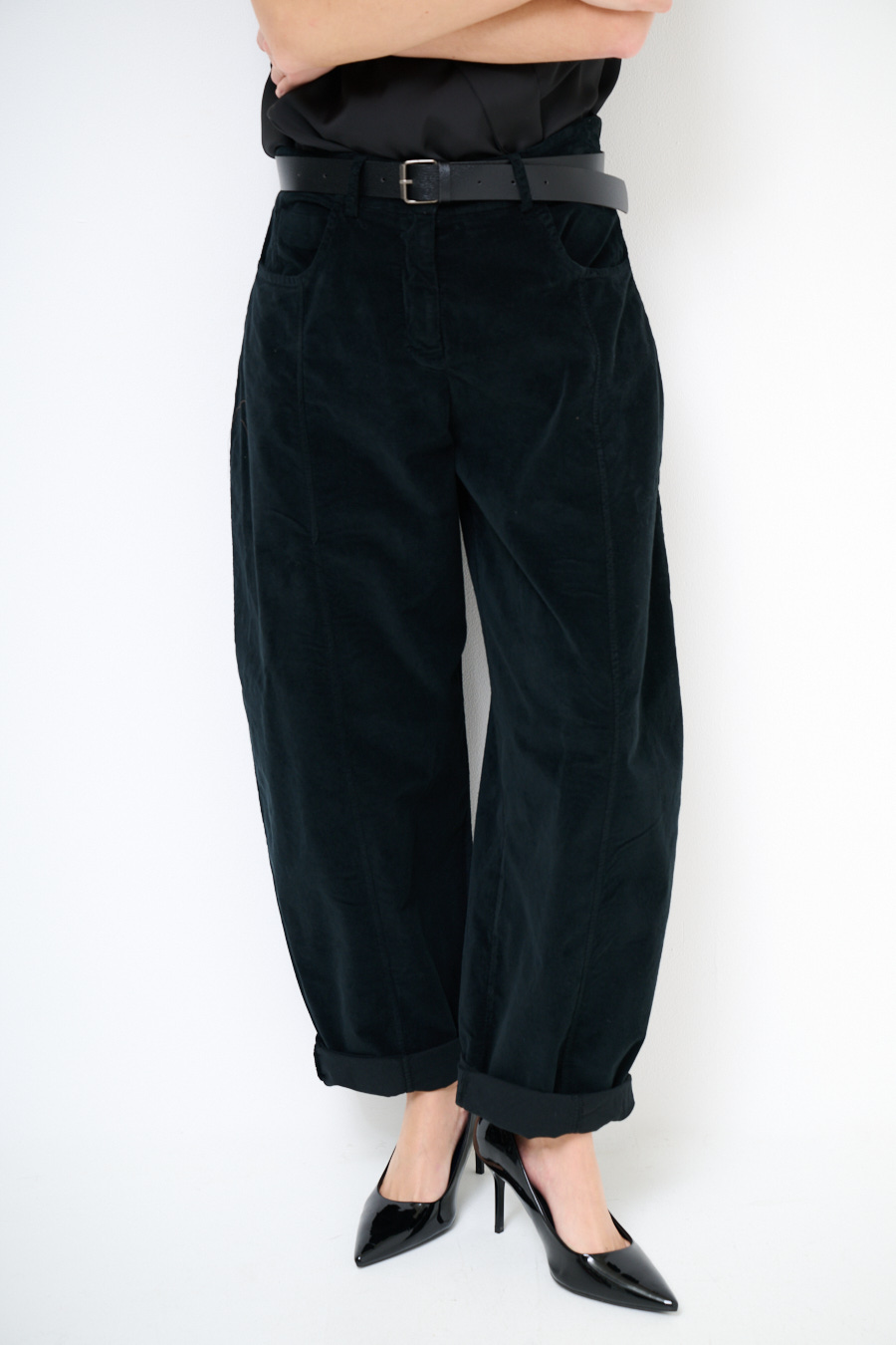Pantalone in velluto a ovetto con cucitura centrale e cintura in vita.