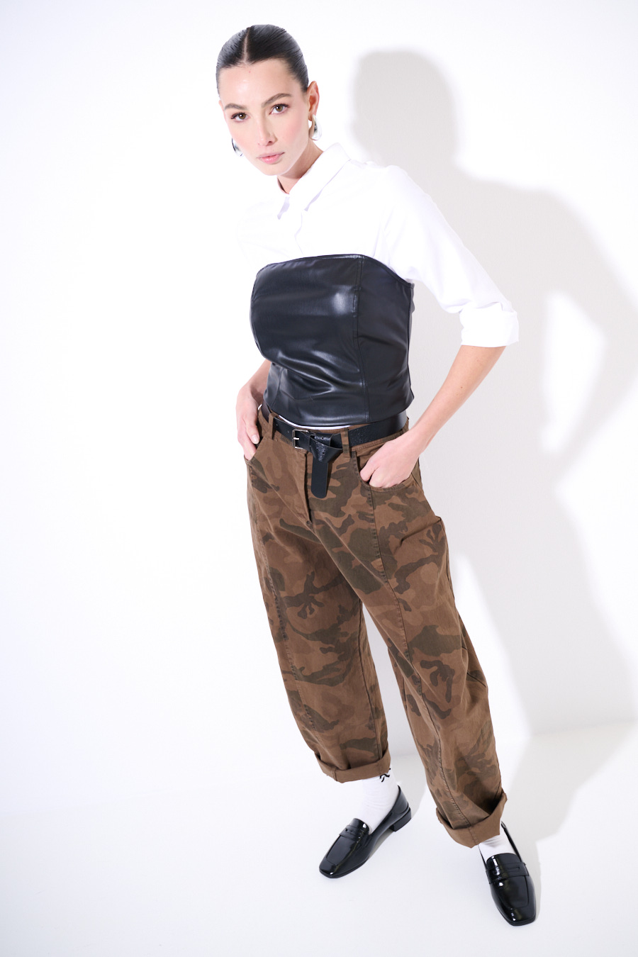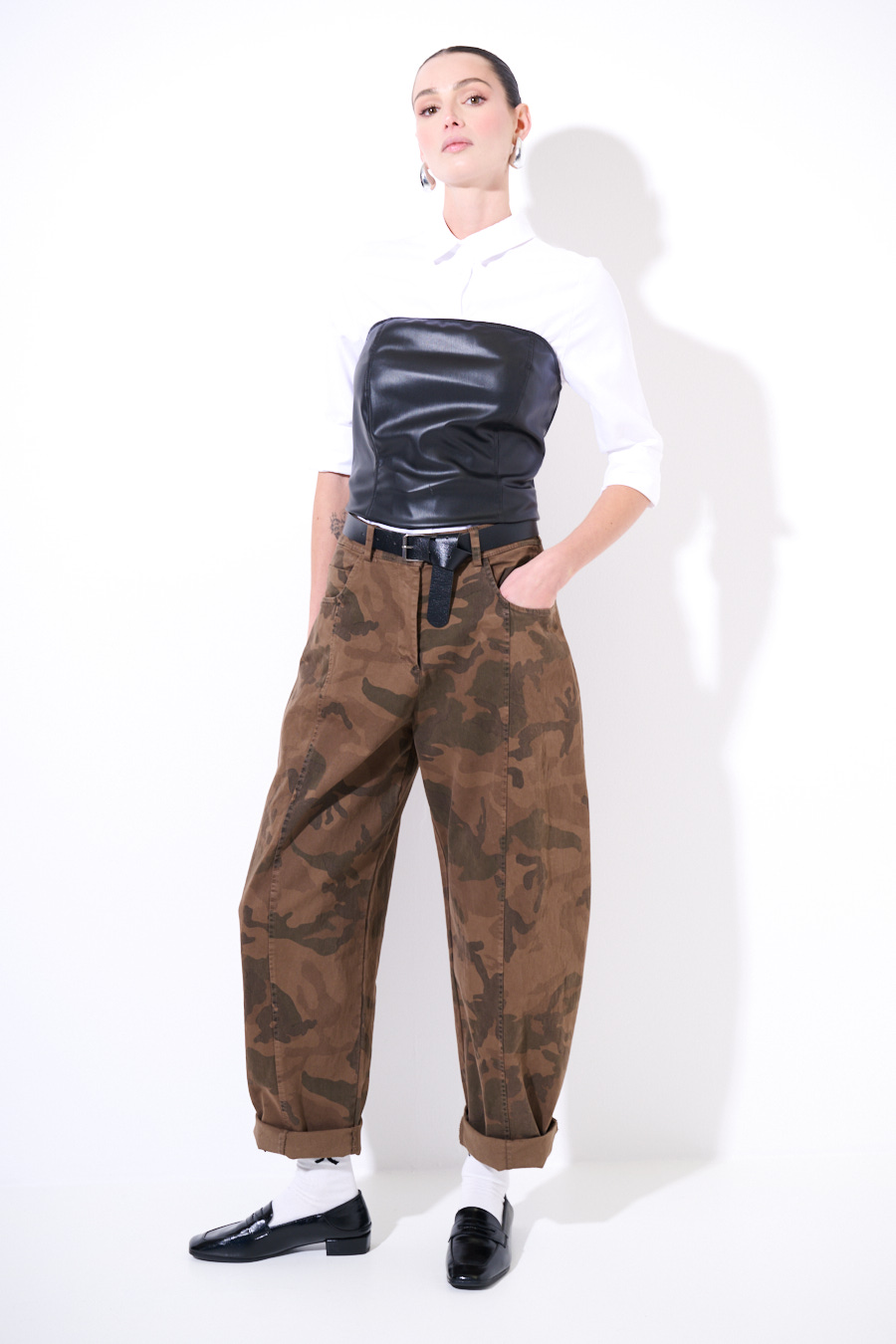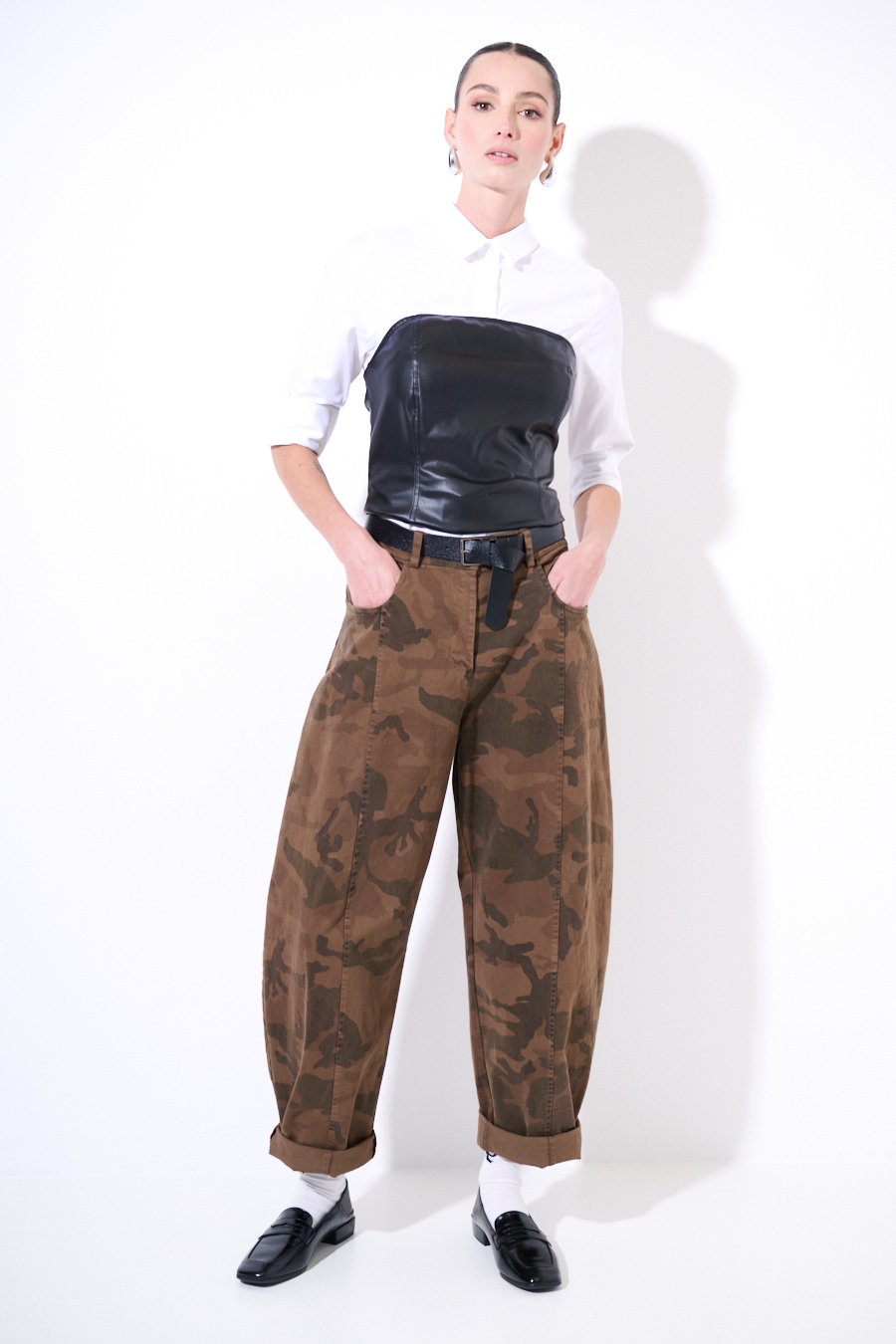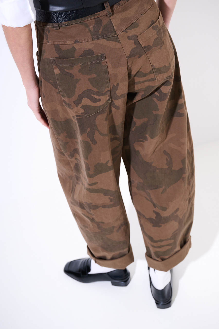 Pantalone a ovetto camouflage, con cucitura frontale e cintura in vita.