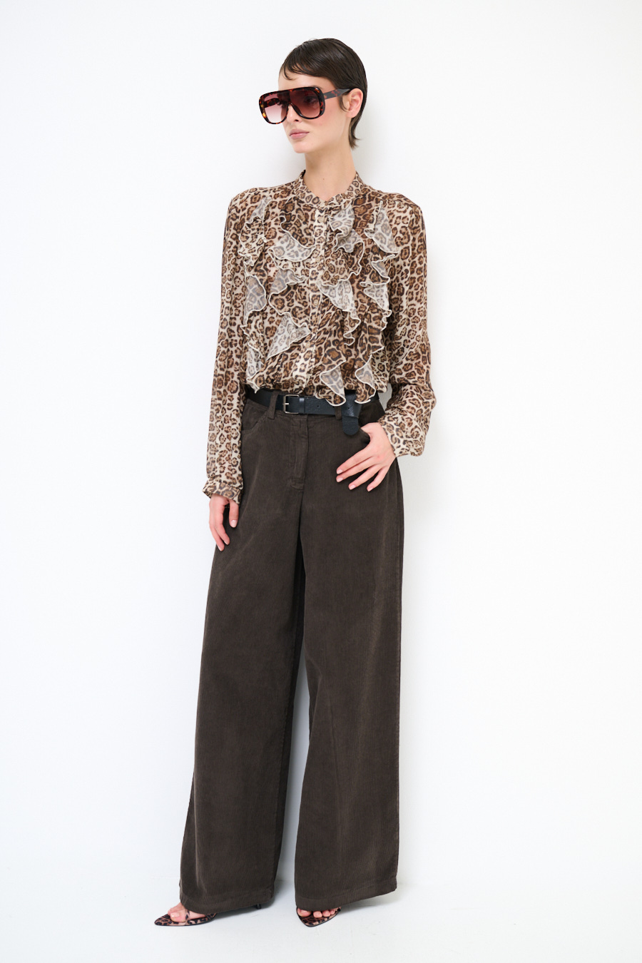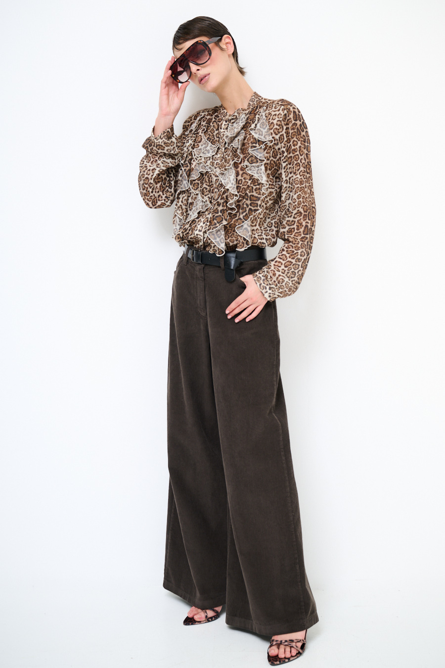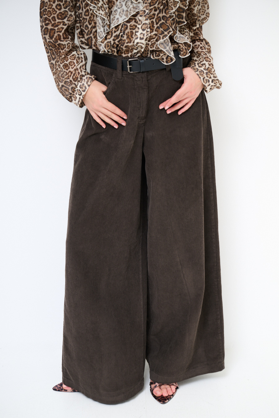 Pantalone a palazzo in velluto a coste con cintura in vita e elasticizzato sul retro, con tasche.