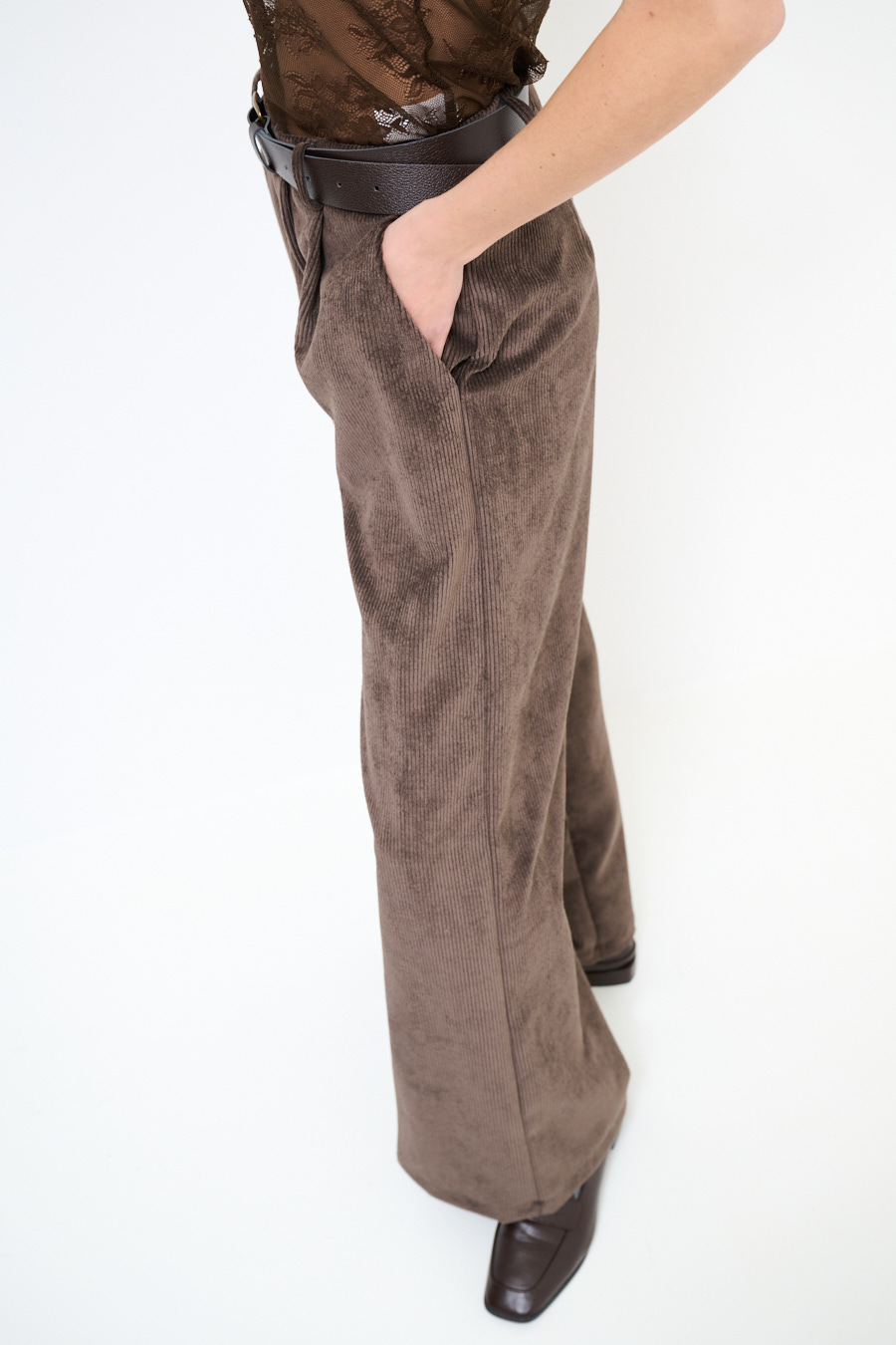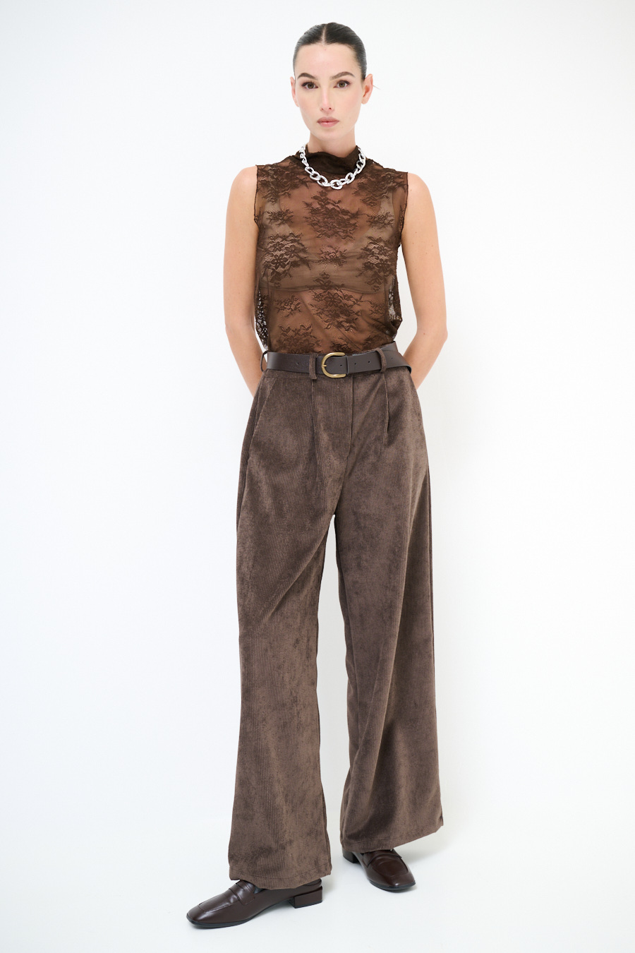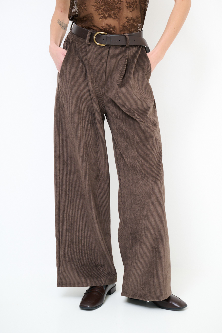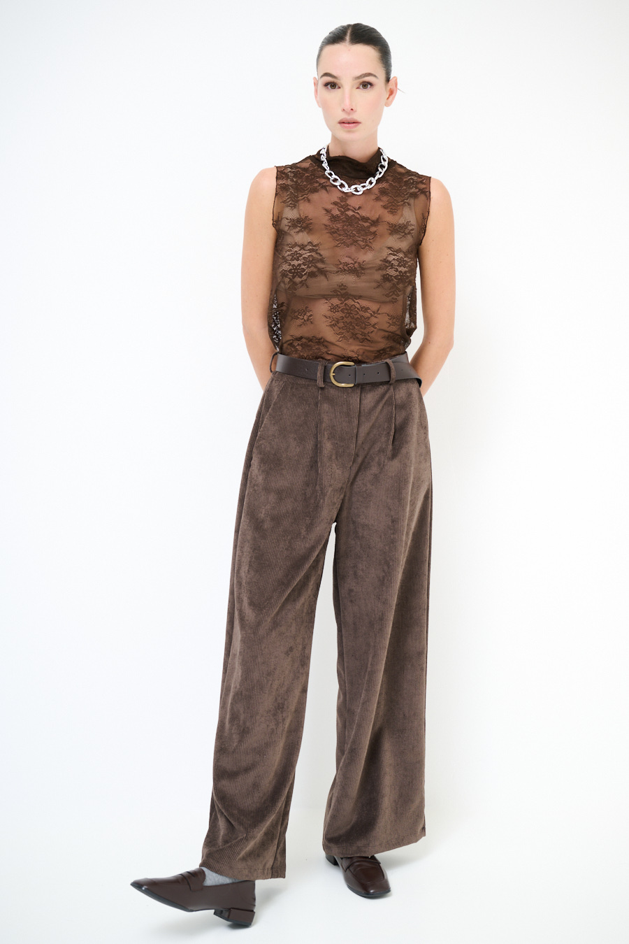 Pantalone a palazzo ampio in velluto a coste, con pinces frontali, e cintura in vita.