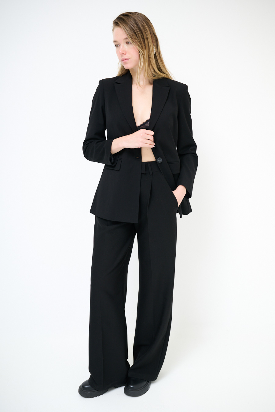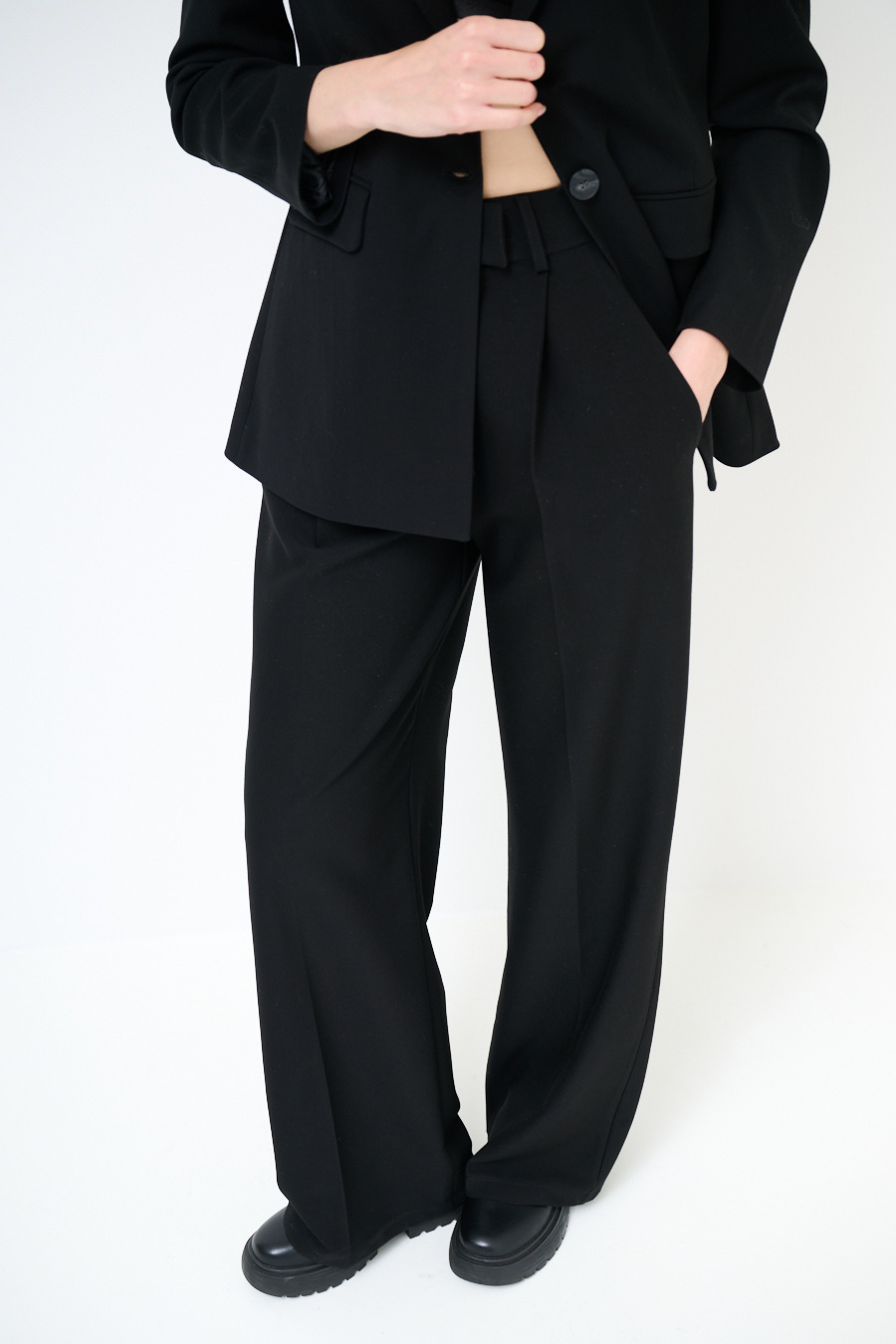 Pantalone a palazzo con piega centrale, chiusura con zip e clip.