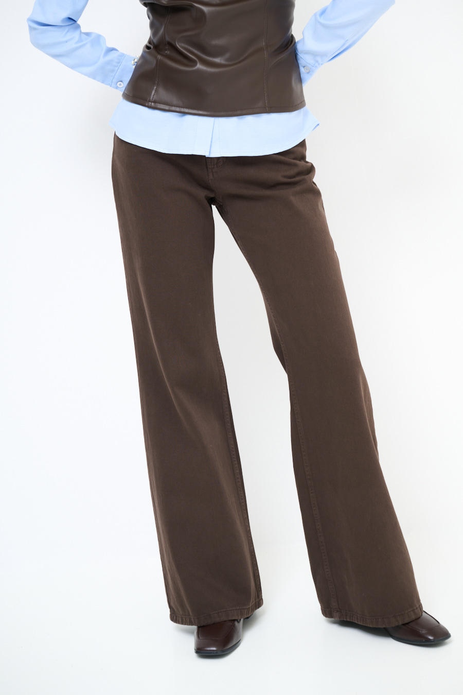 Pantalone basic dritto in gabardina di cotone a tintura effetto old a 5 tasche con patch con marchio KIKISIX bianca sul retro.