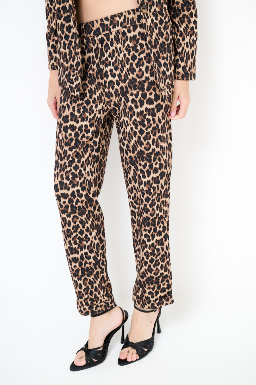 Pantalone basic slim maculato elasticizzato con fascione elastico in vita e risvolto sul fondo.