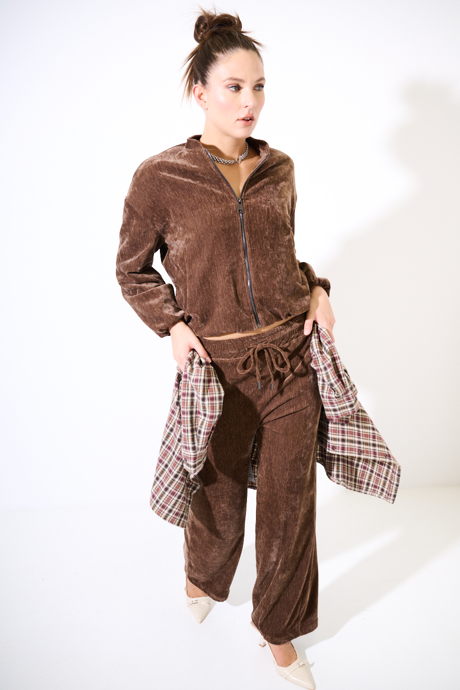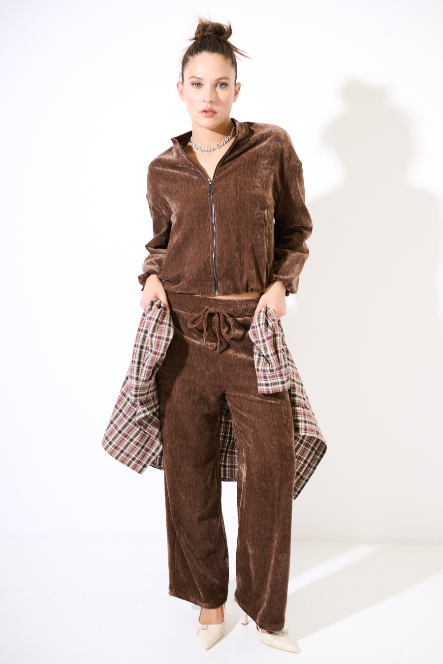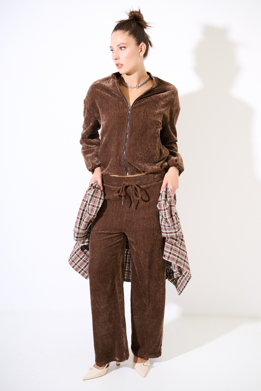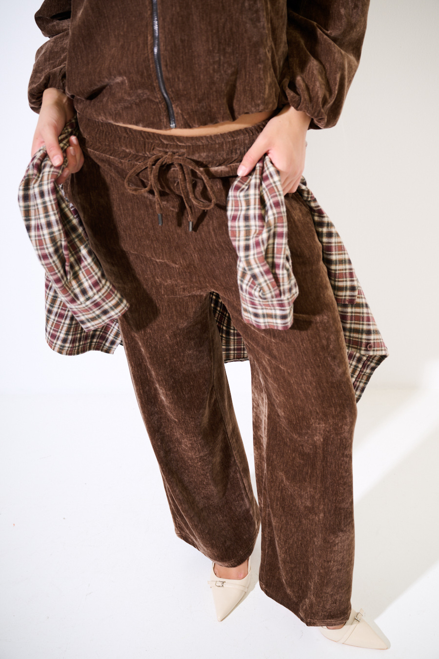 Pantalone in velluto ampio sul fondo e con coulisse in vita.