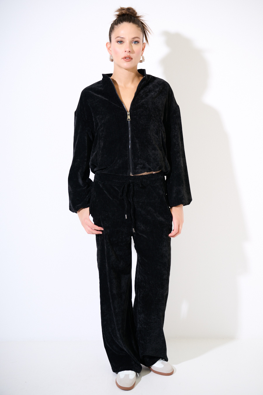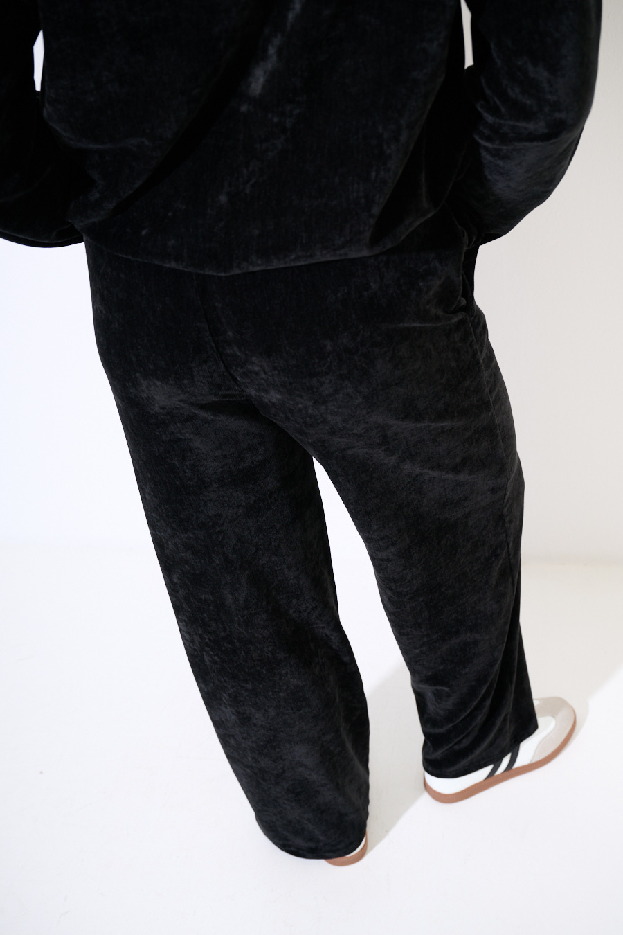 Pantalone in velluto ampio sul fondo e con coulisse in vita.