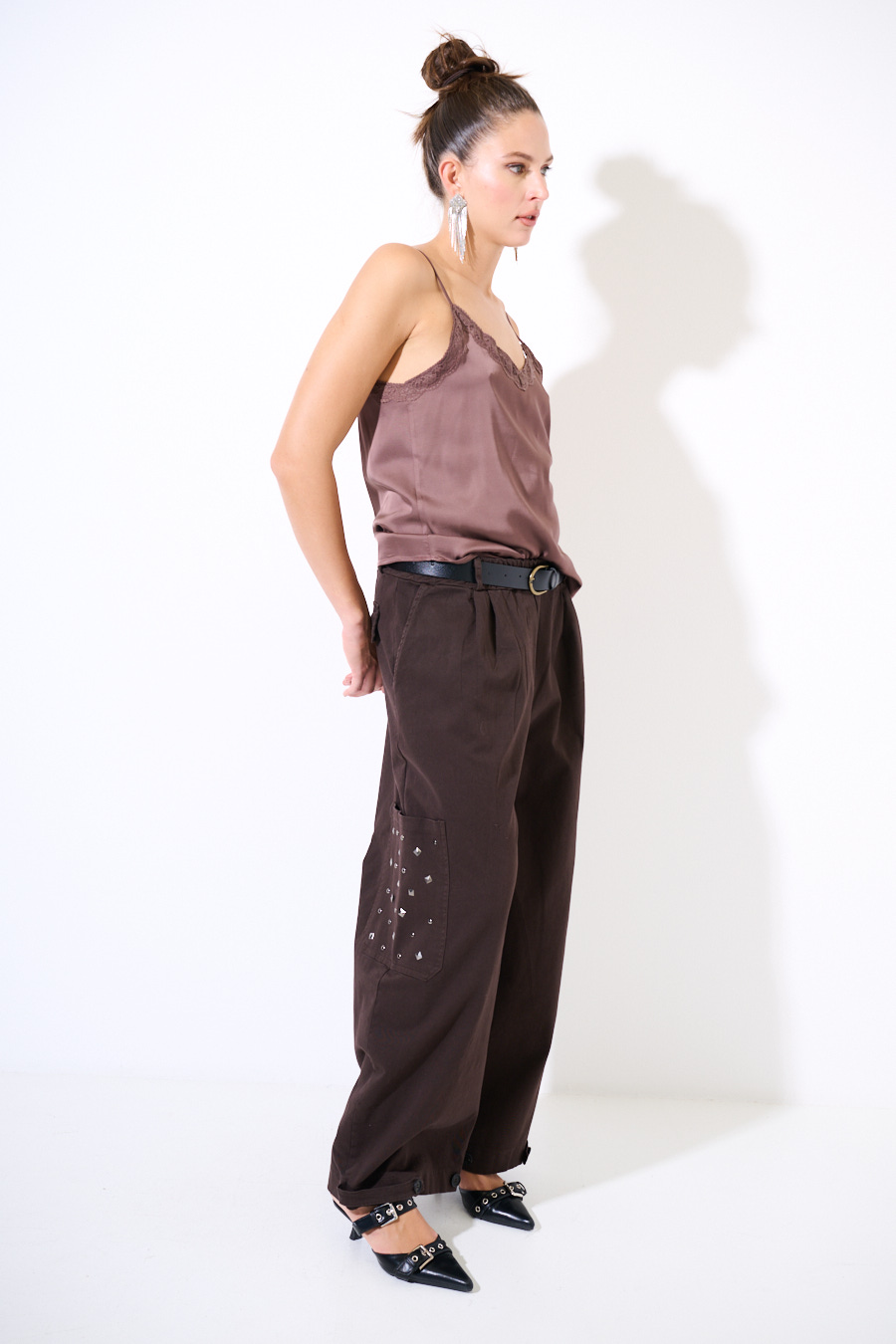Pantalone ampio con tasconi laterali con borchiette applicate e ripresa sul fondo con bottoni, elasticizzato in vita e con cintura.