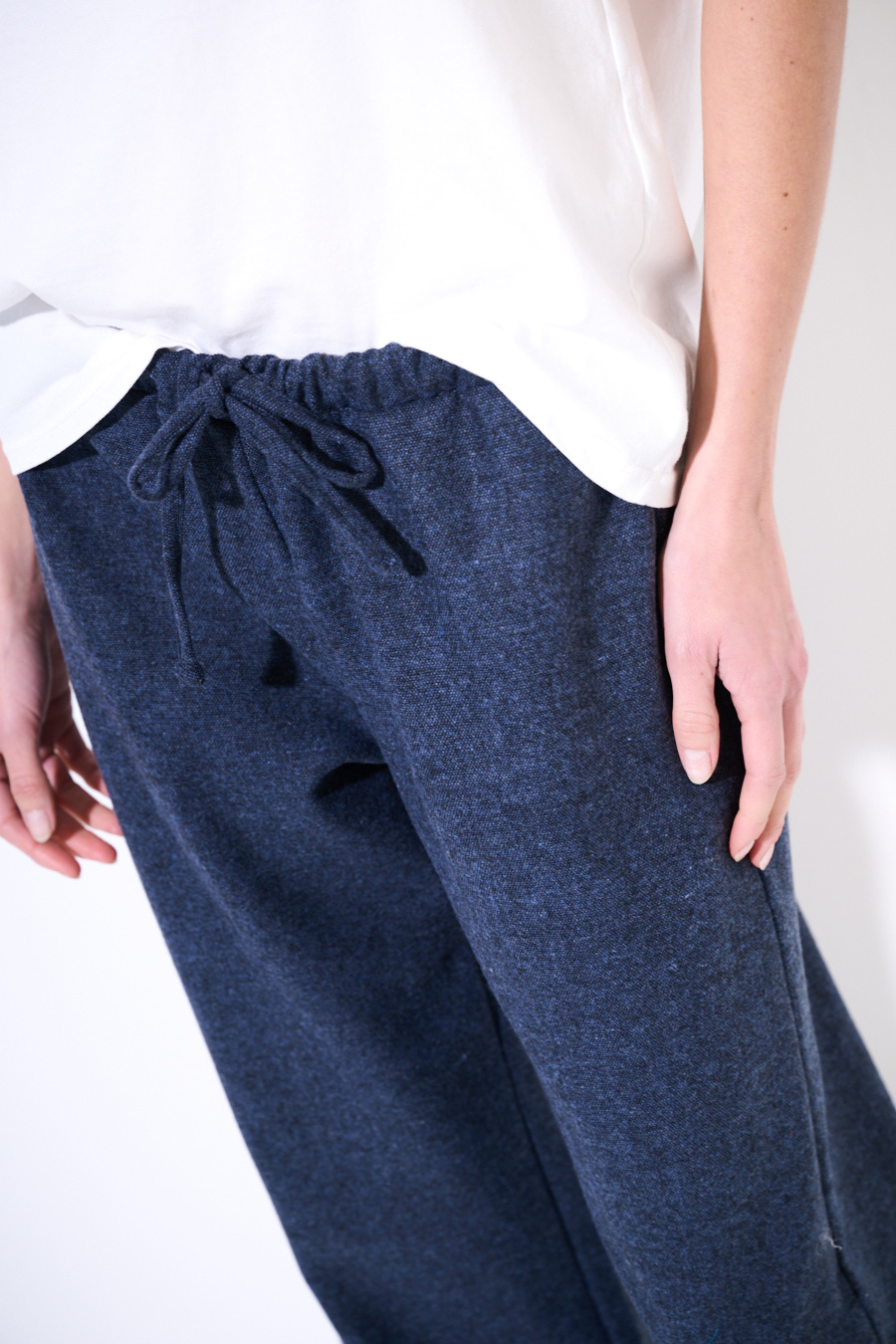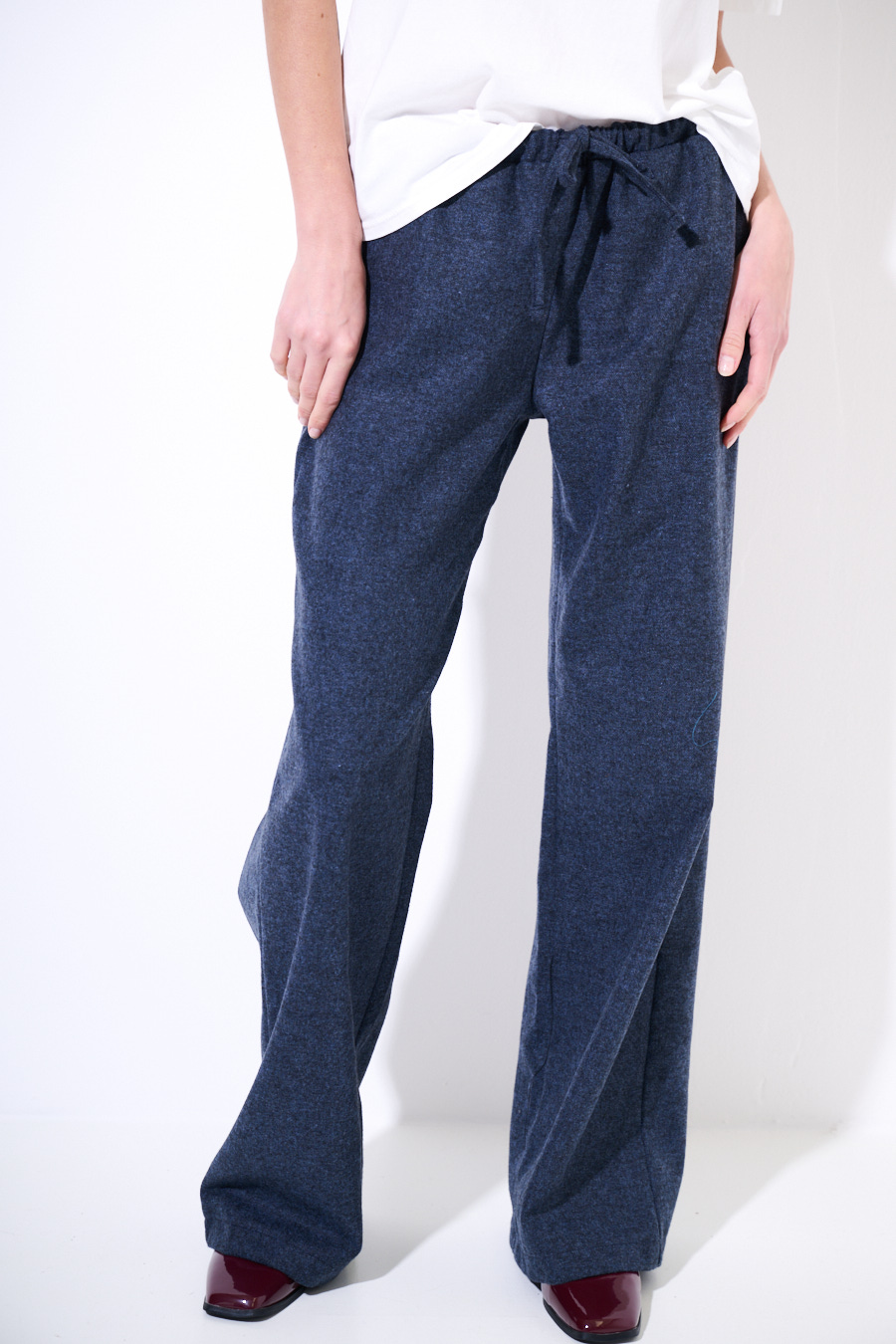 Pantalone dritto in flanella con coulisse ed elastico in vita.