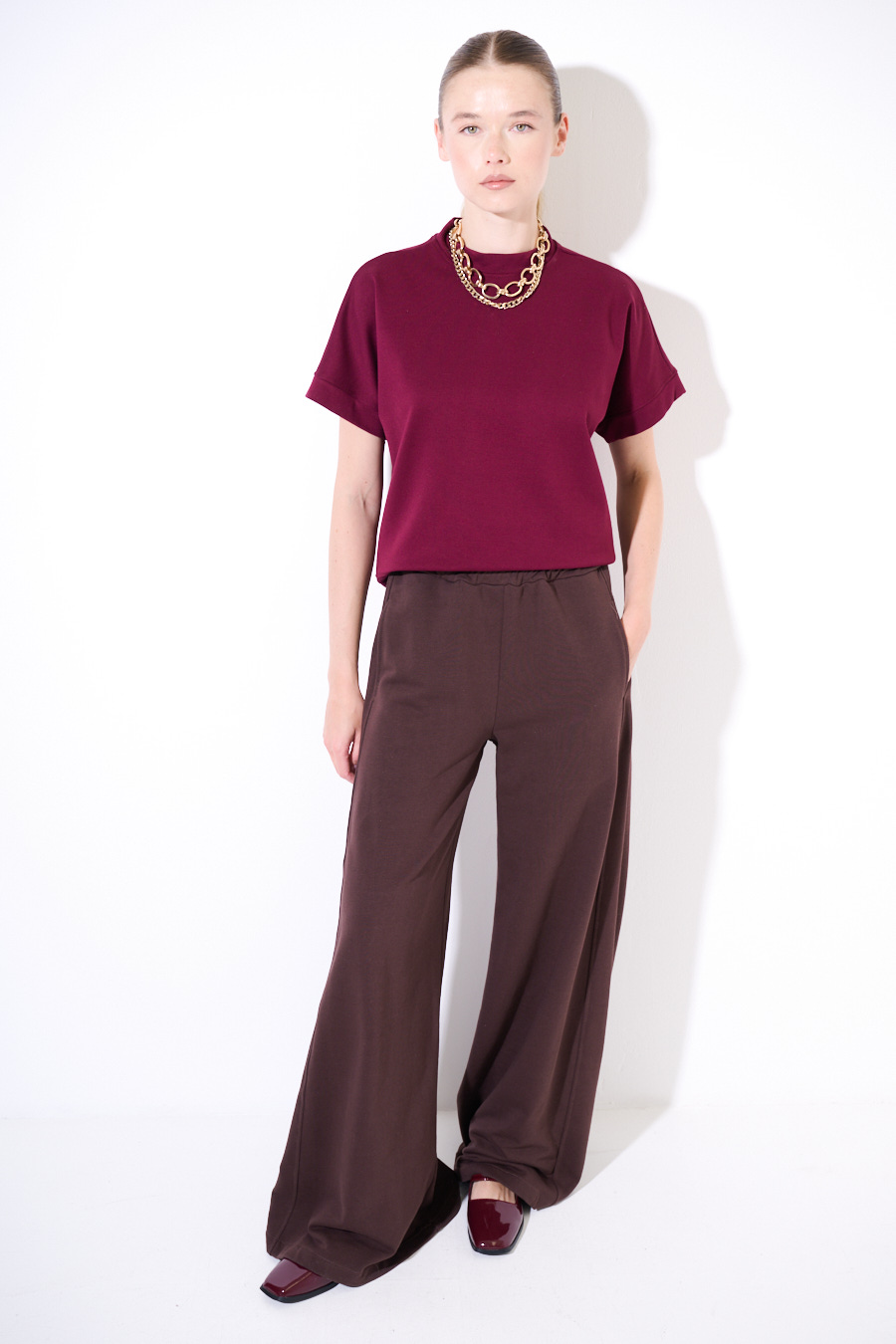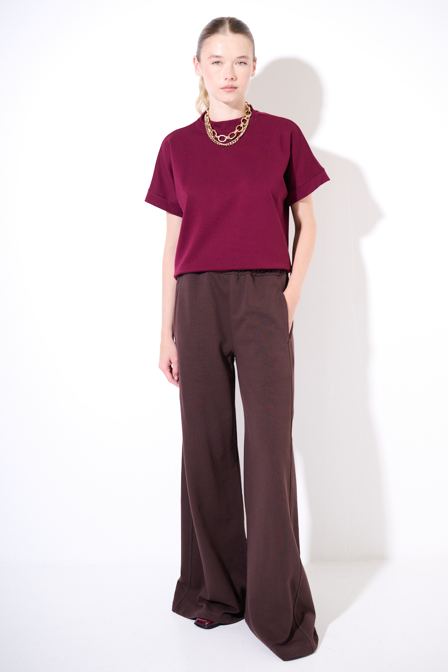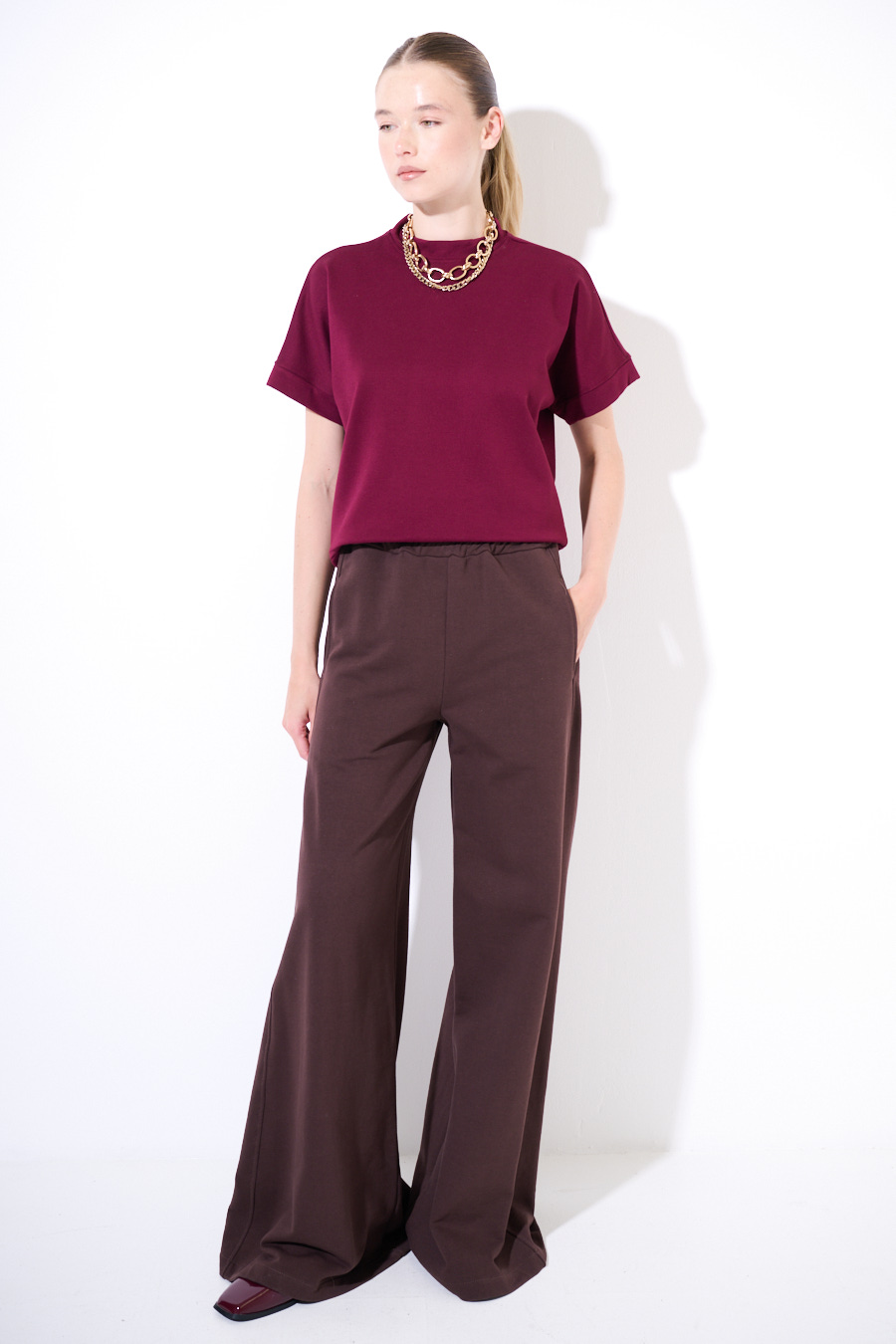 Pantalone a palazzo ampio in felpa garzata con elastico in vita e cucitura frontale.