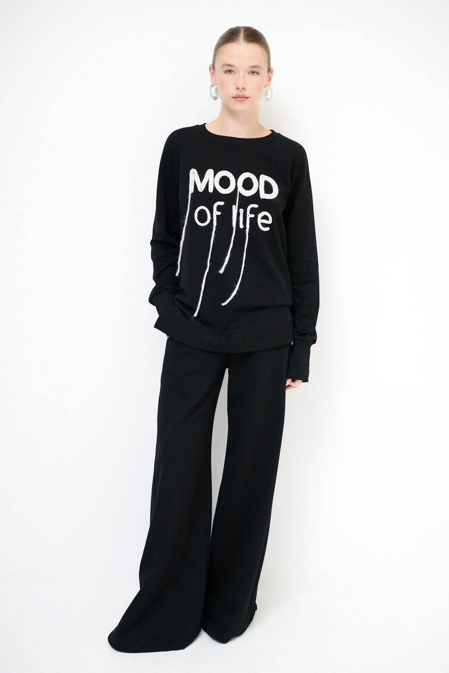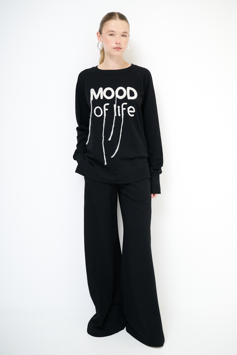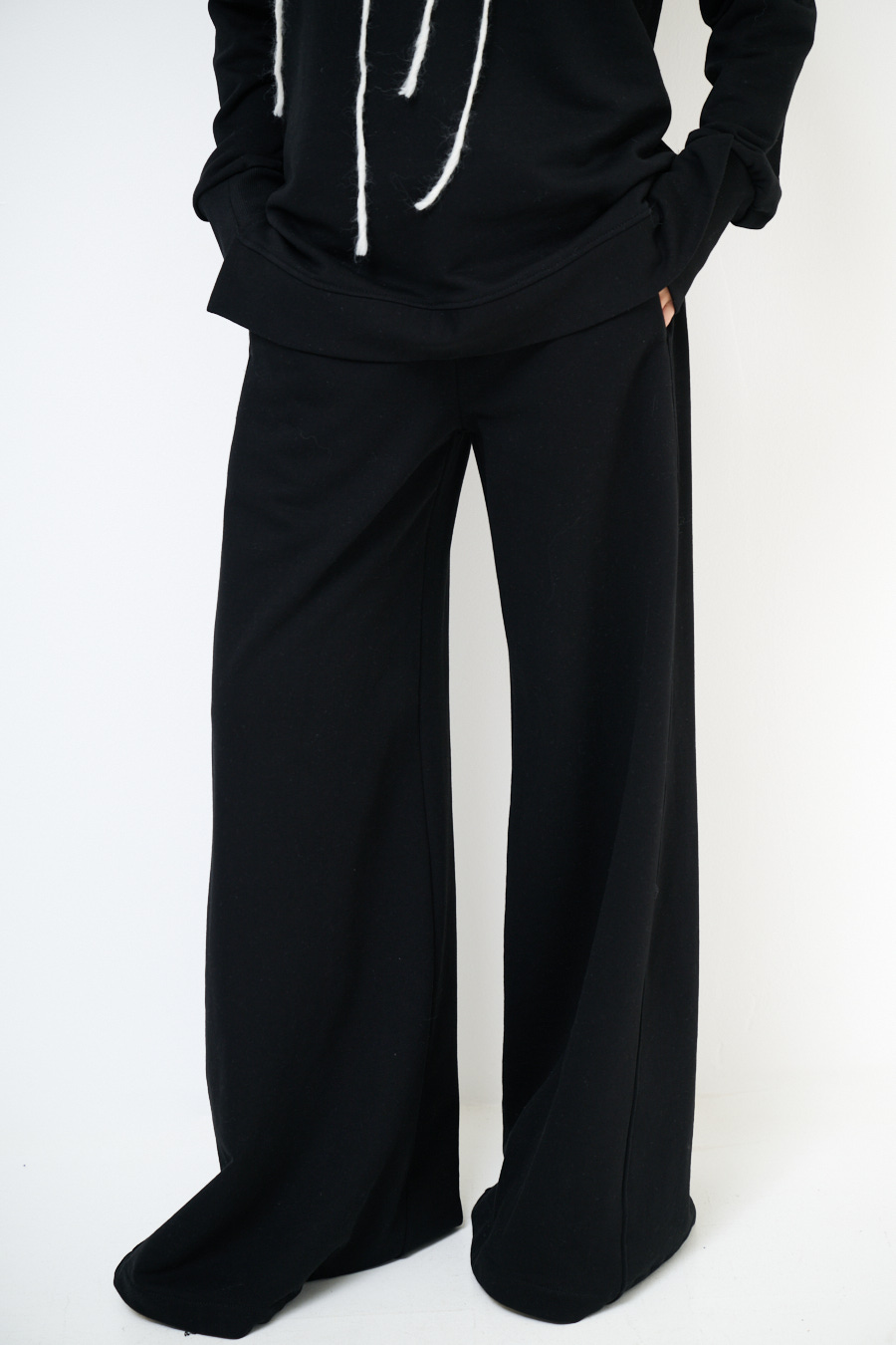 Pantalone a palazzo ampio in felpa garzata con elastico in vita e cucitura frontale.