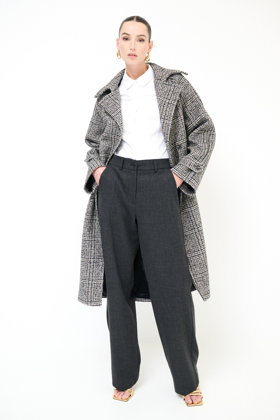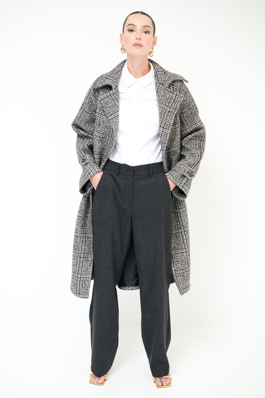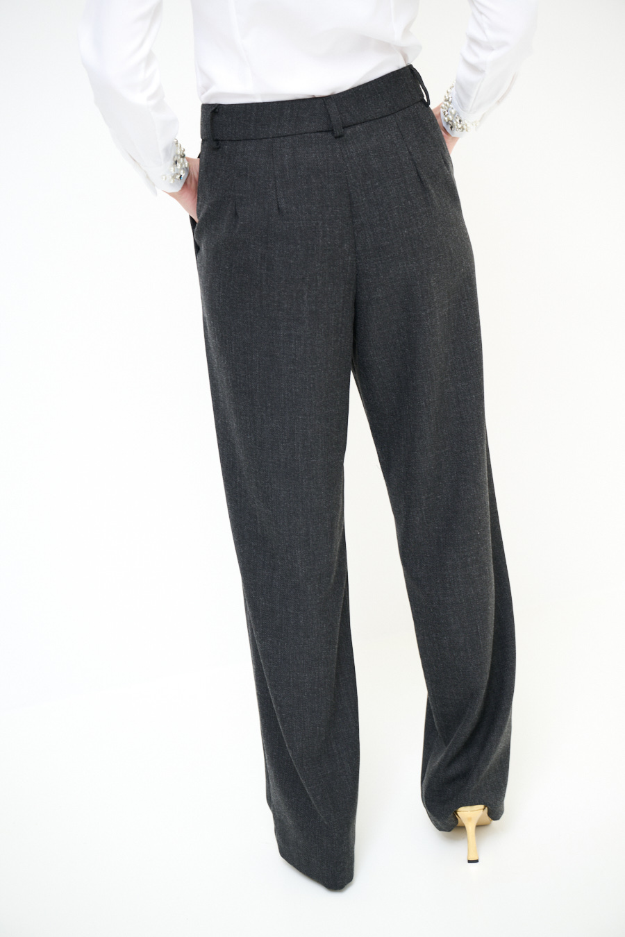 Pantalone in flanella ampio con tasche e chiusura con zip e bottone.