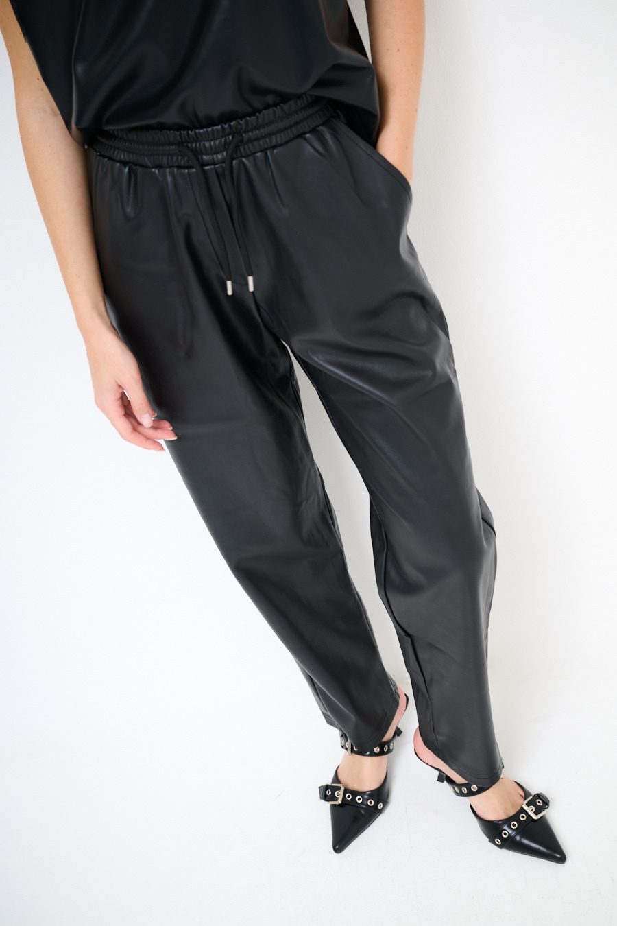 Pantalone jogger in ecopelle con elastico e coulisse in vita.