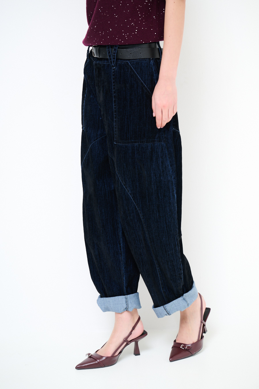 Pantalone a ovetto effetto ciniglia scamosciata, con cuciture a vista, ampi tasconi e cintura in vita con passanti larghi.