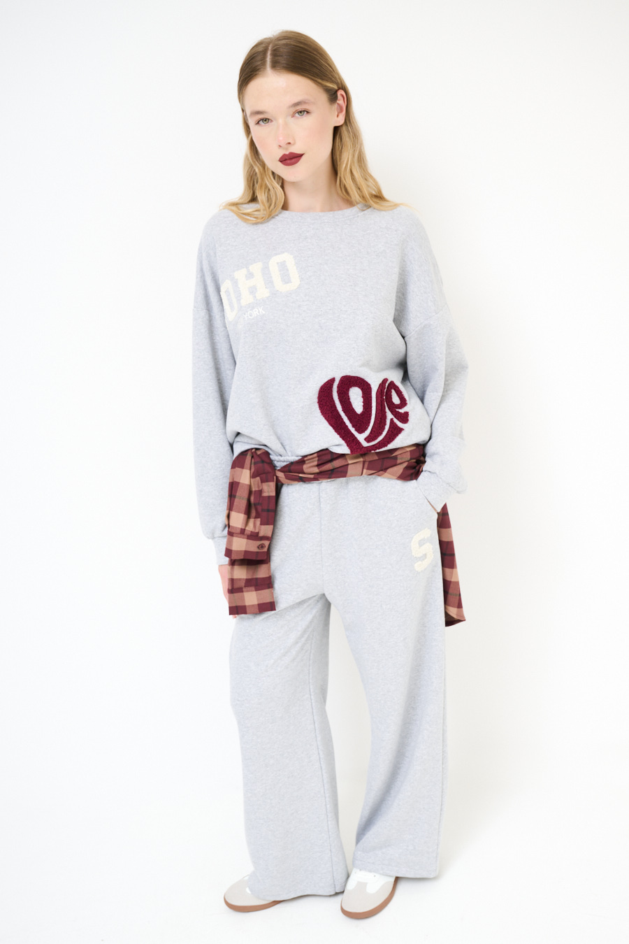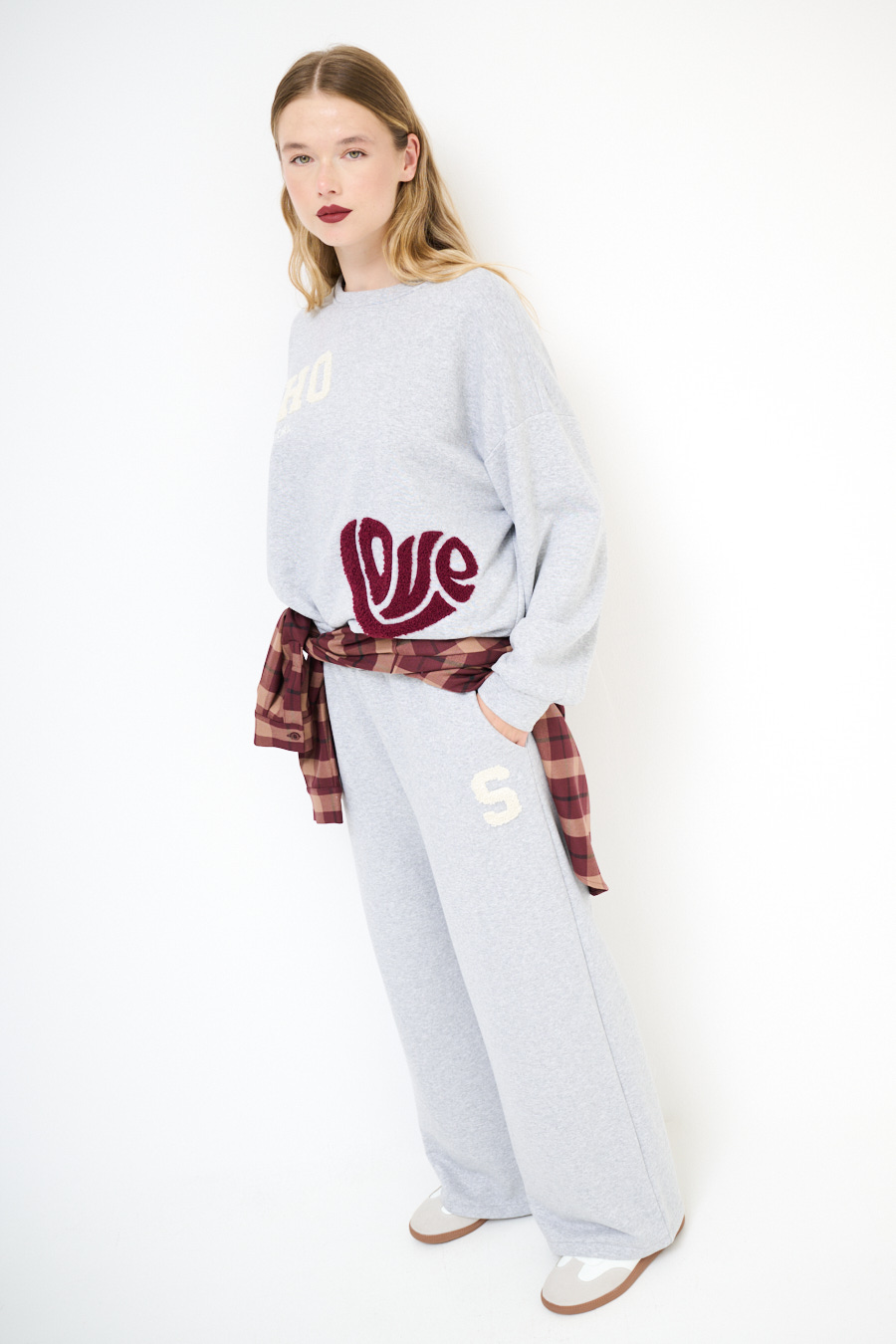 Pantalone in felpa garzata ampio con elastico in vita e ricamo S sul fianco.