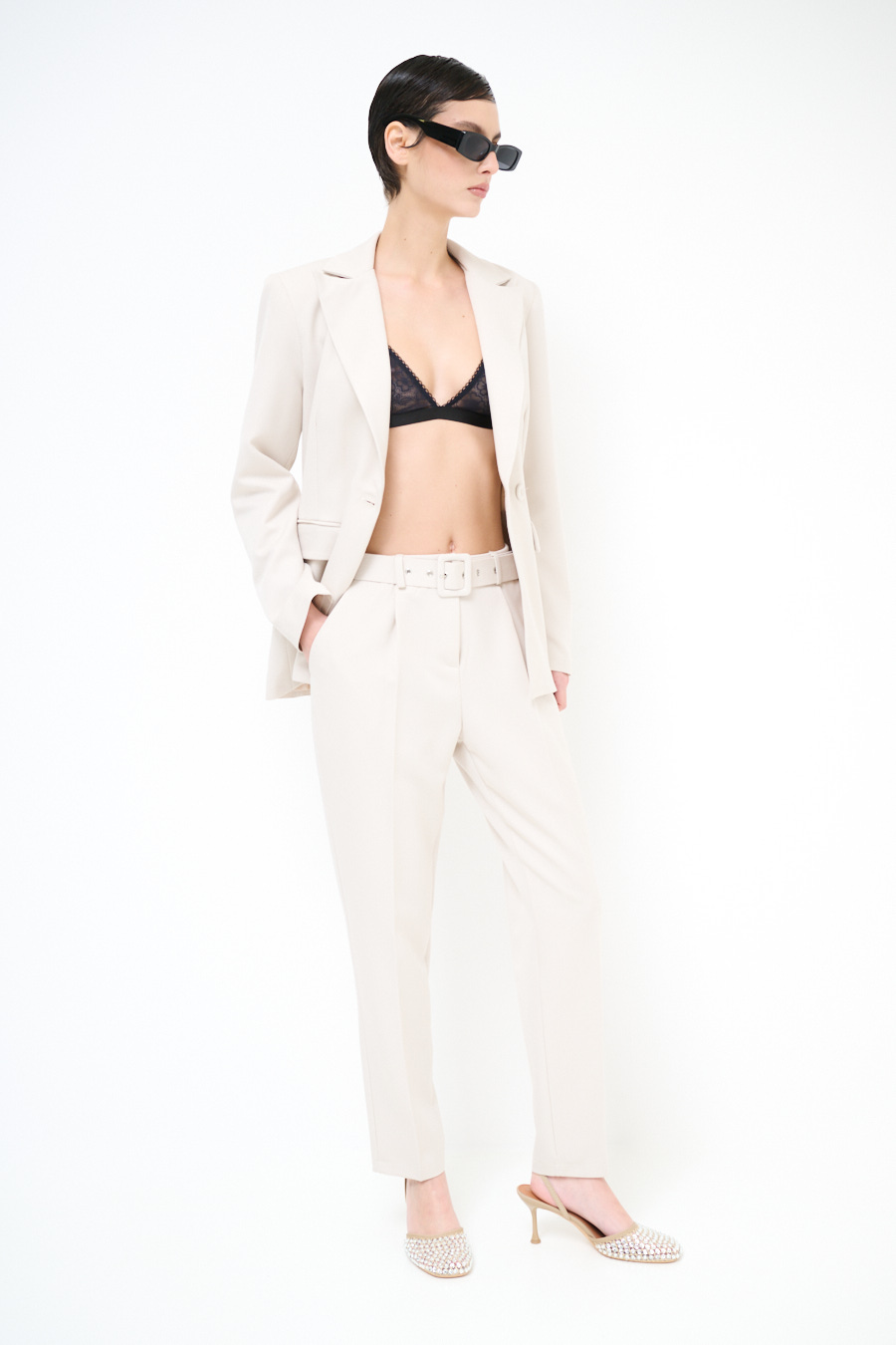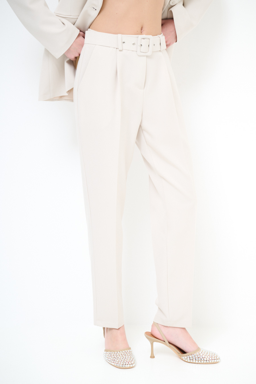 Pantalone slim con piega centrale e pinces, con cintura foderata in vita.