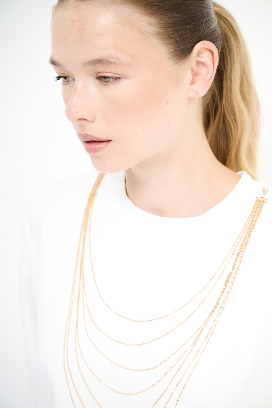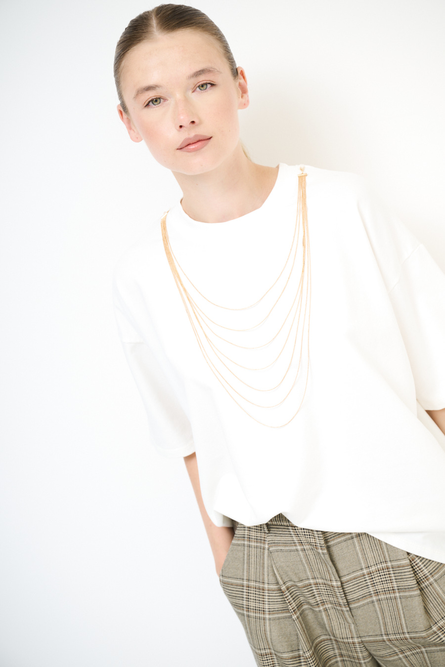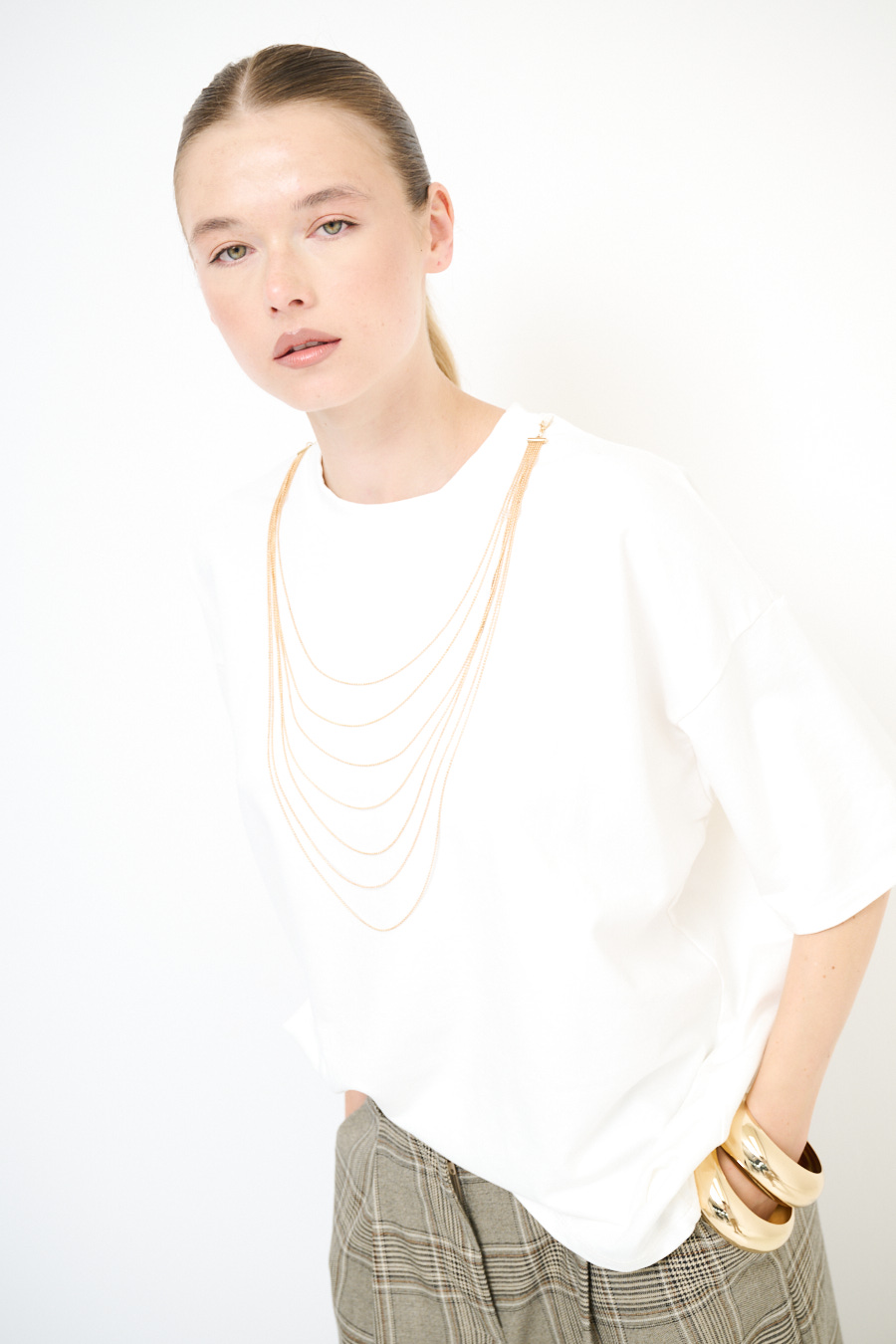 T-shirt oversize con spalla calata, con applicazione di collana lunga dorata sottile, garzata internamente.