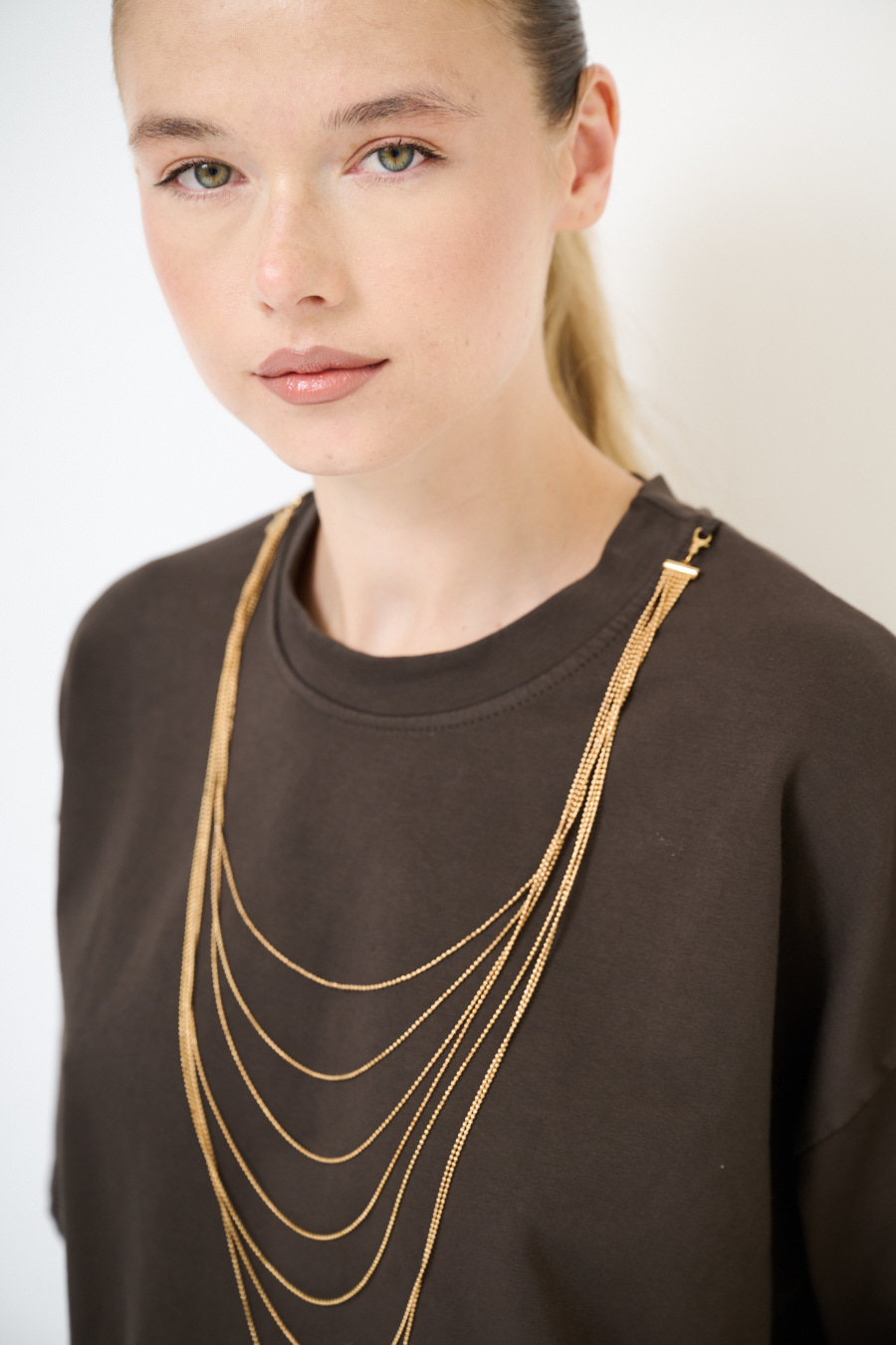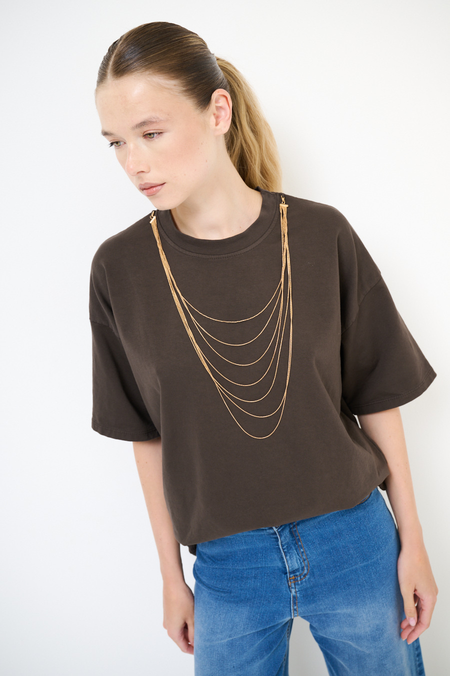 T-shirt oversize con spalla calata, con applicazione di collana lunga dorata sottile, garzata internamente.