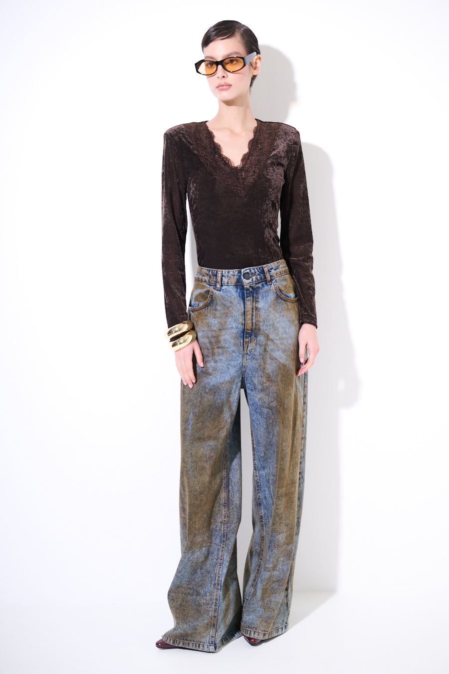 Body floccato in ciniglia con inserti in pizzo e con manica lunga e interno con fodera.