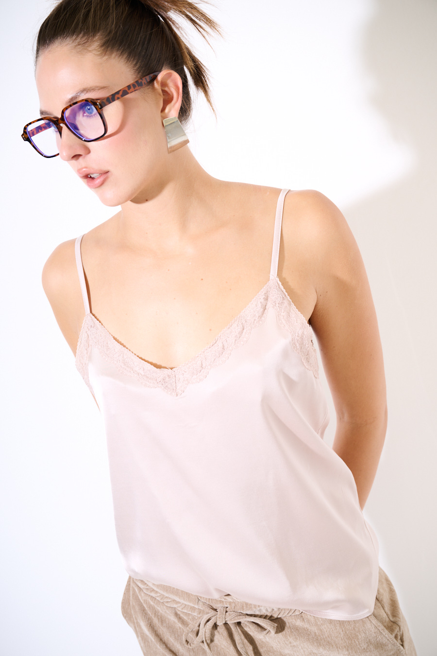 Top in raso con scollatura in pizzo e con spalline sottili regolabili.