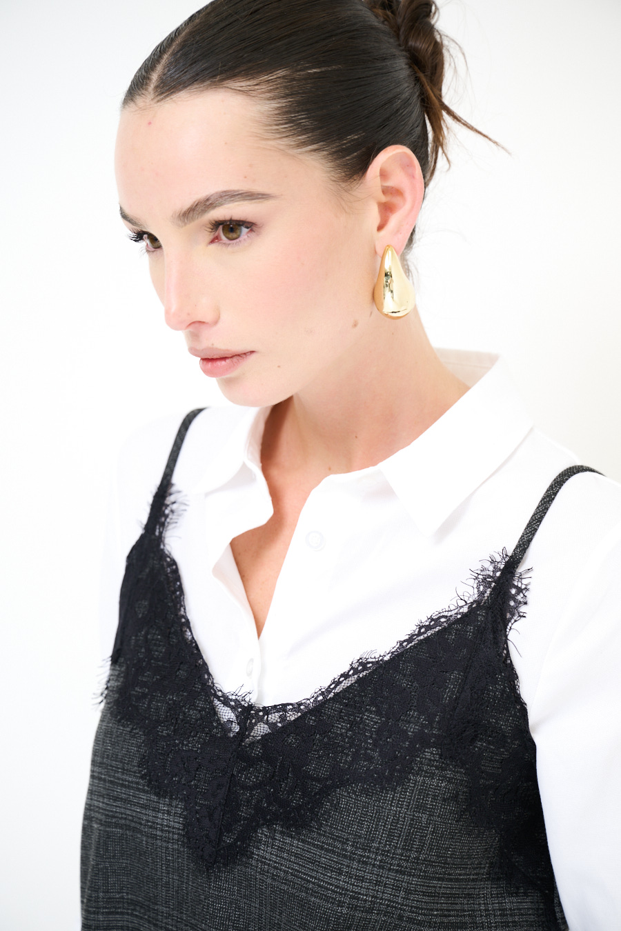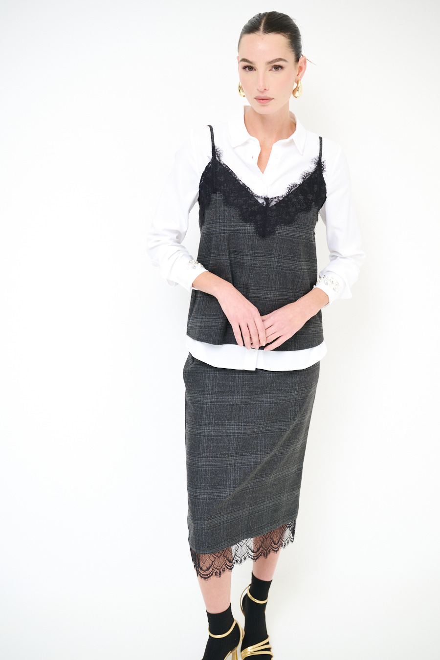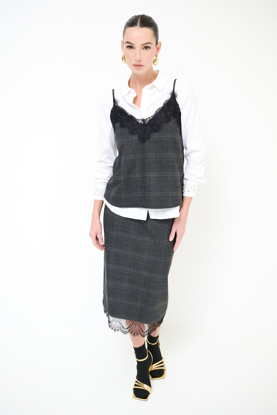 Top con micro check con pizzo applicato sullo scollo e spalline sottili regolabili.