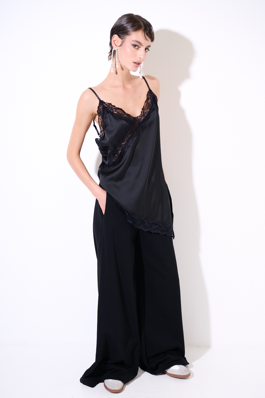 Top in raso a tinta unita con pizzo nero, scollo a v e con spalline sottili regolabili.