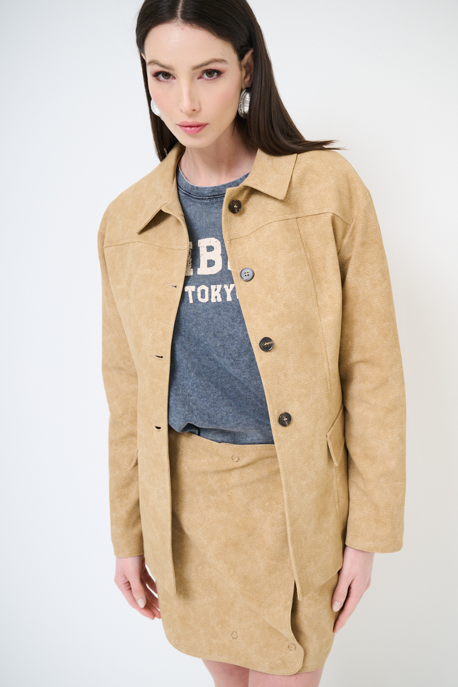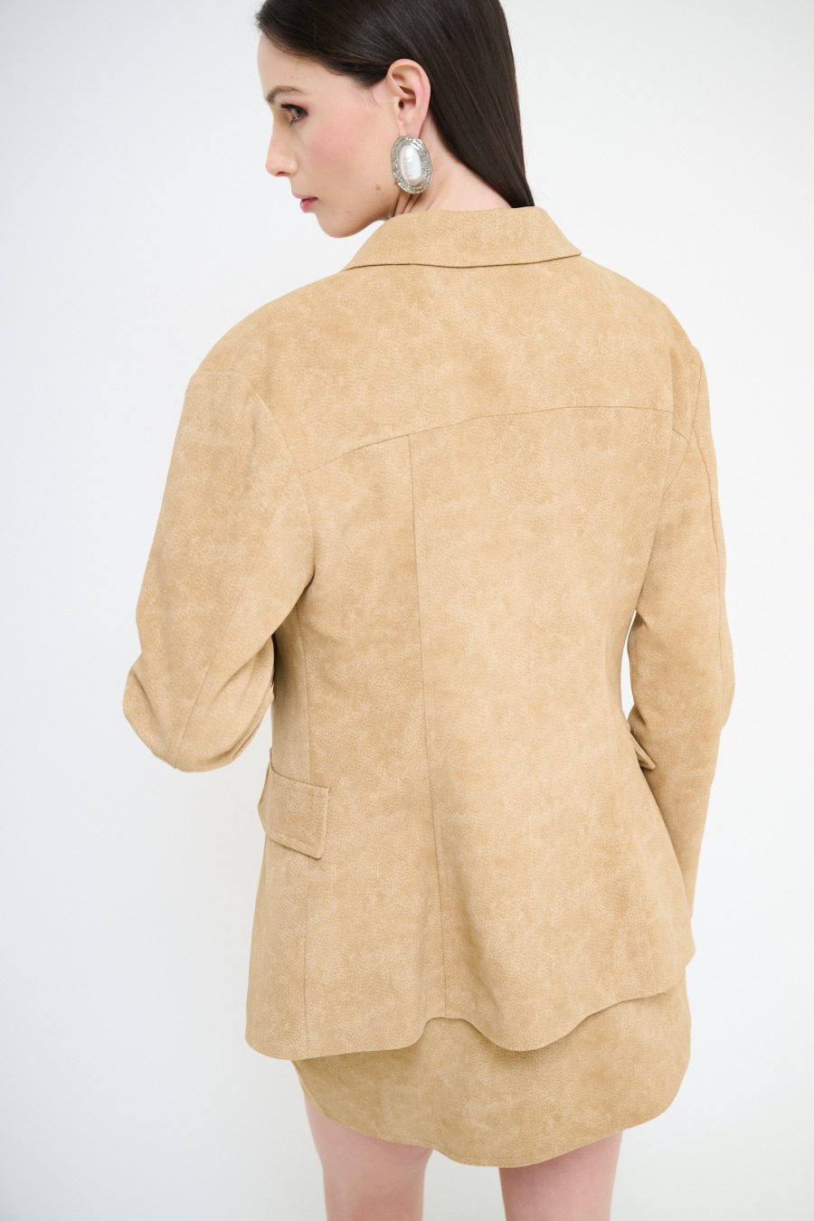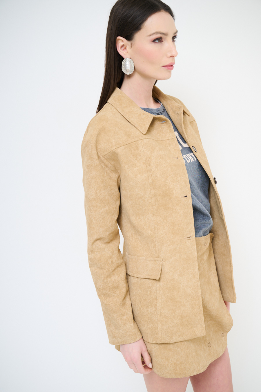 Fitted single-breasted jacket in suede with crust effect. Central buttoning down to mid-length, shirt collar and lined interior