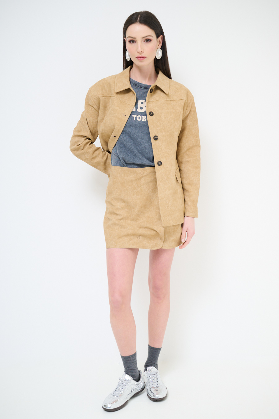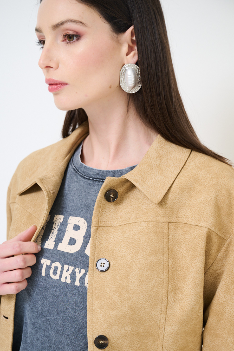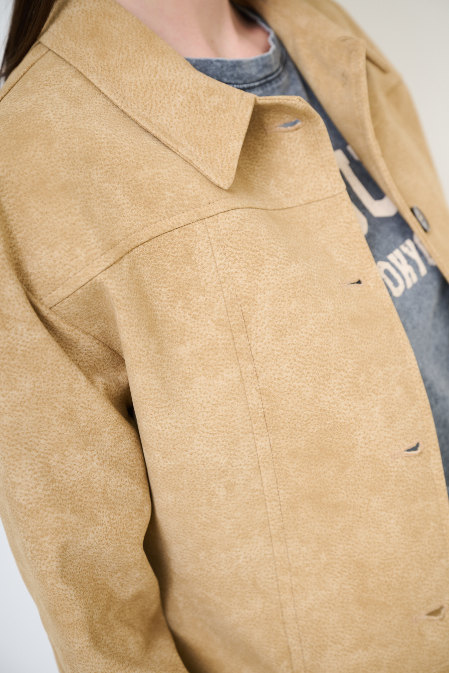 Fitted single-breasted jacket in suede with crust effect. Central buttoning down to mid-length, shirt collar and lined interior