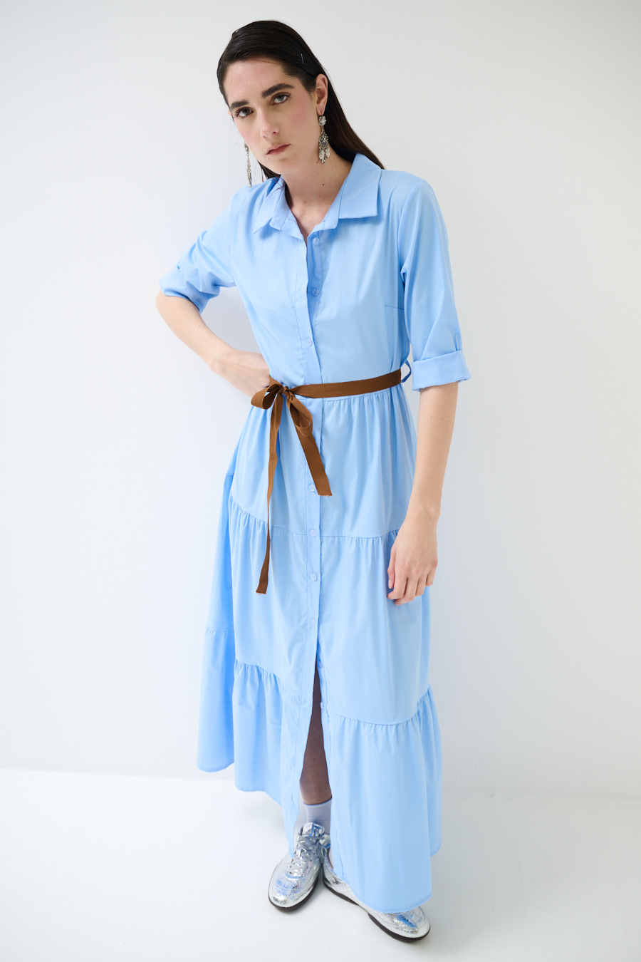 ABITO CHEMISIER LUNGO CON BALZE E MANICA A 3/4 CELESTE