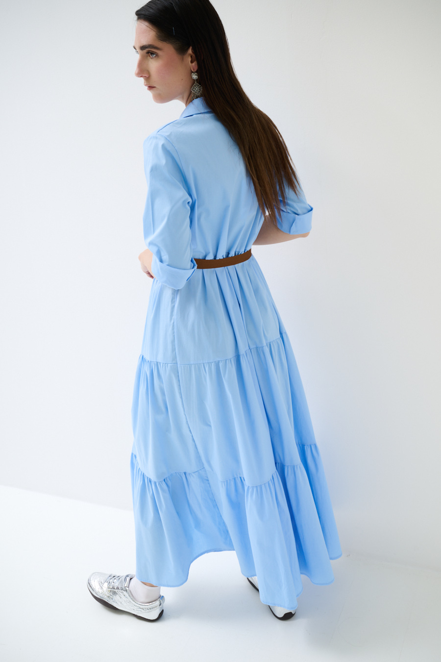 Long poplin shirt dress with 3/4 sleeves, central buttoning and flounces, with belt