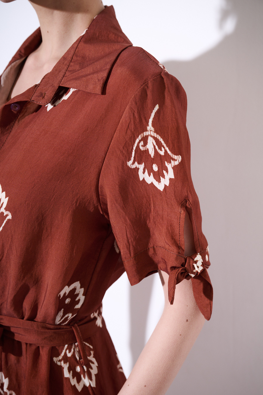 Half-sleeve chemise-style dress in viscose with bow and print