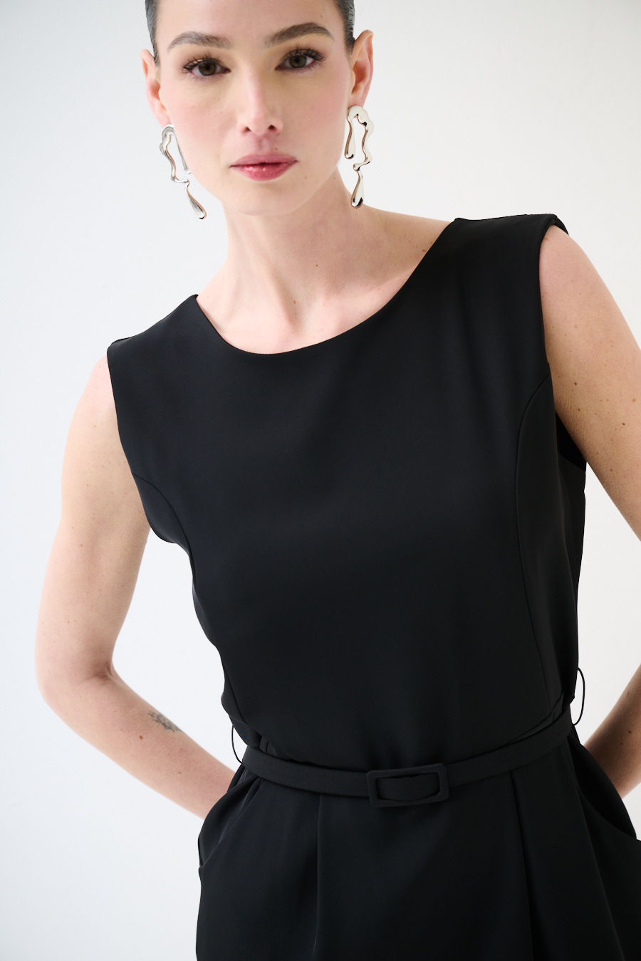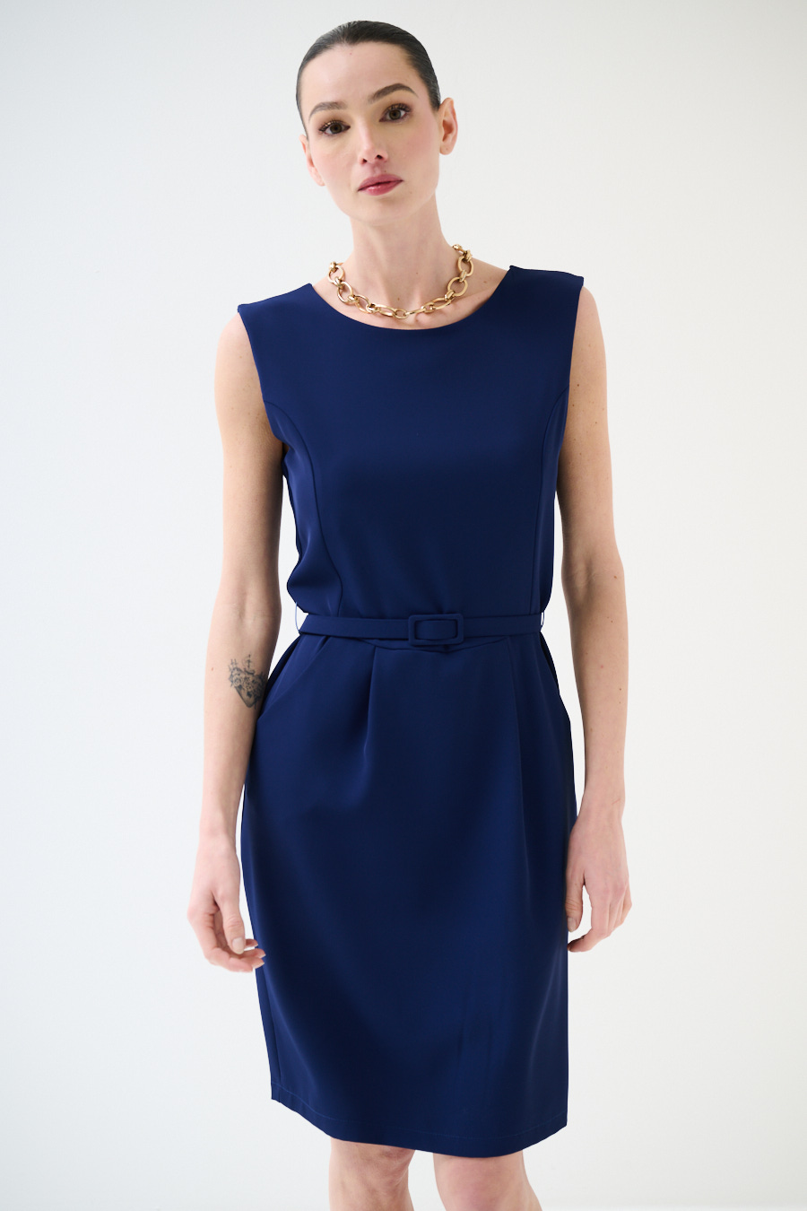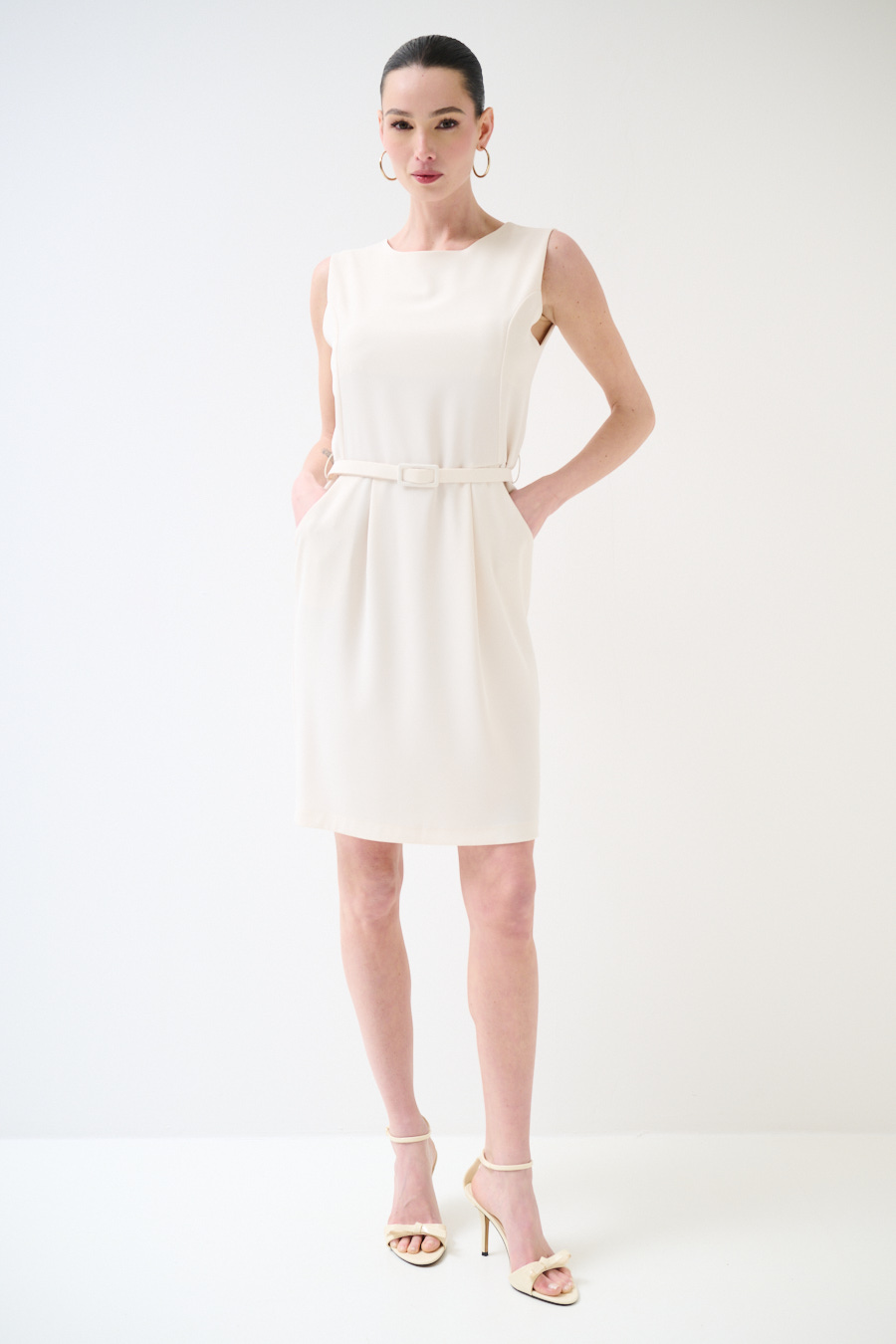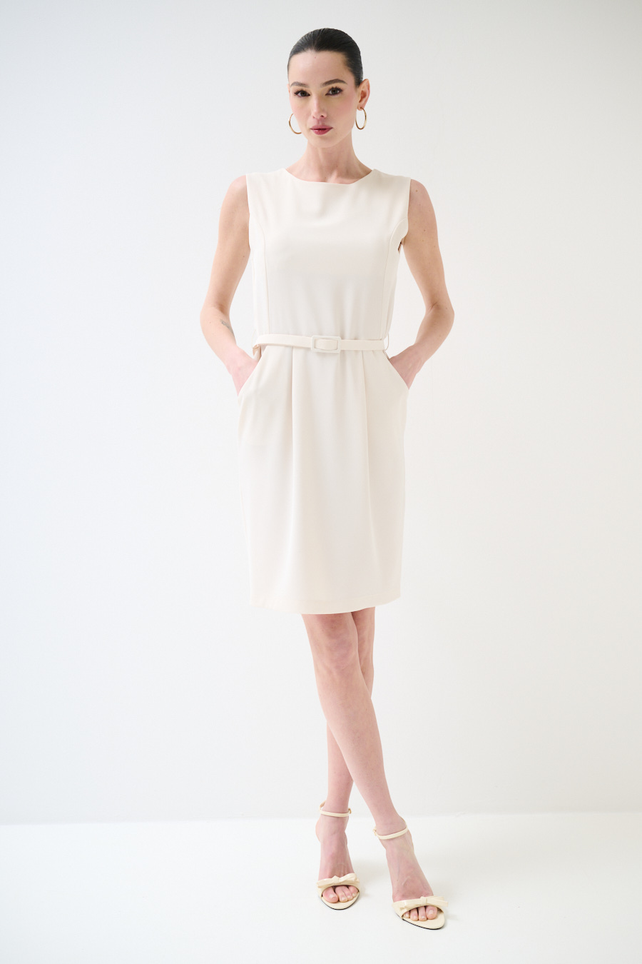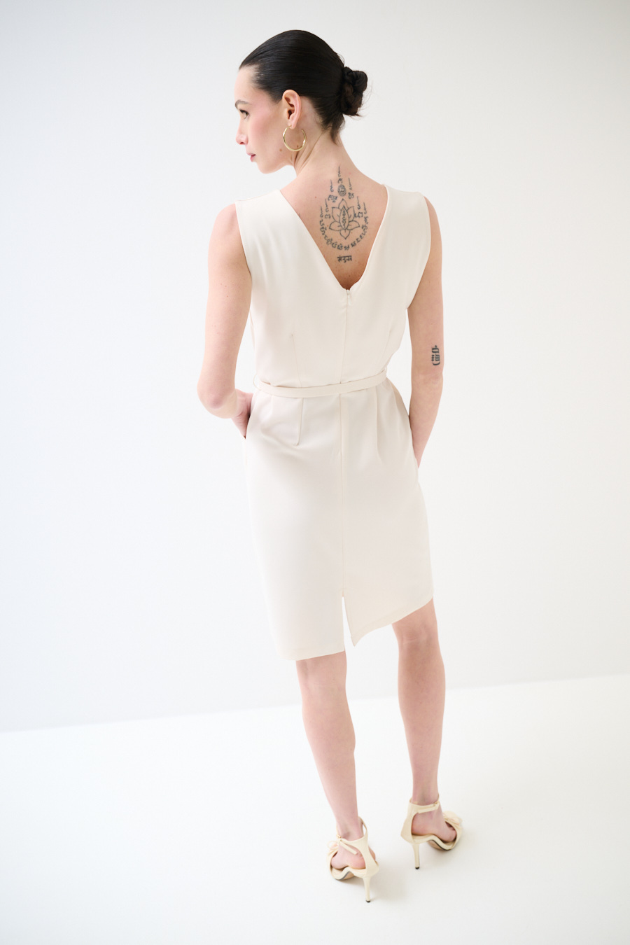 Abito corto smanicato in cadì con taschini e cintura in vita, scollo a v sul retro con zip nascosta
