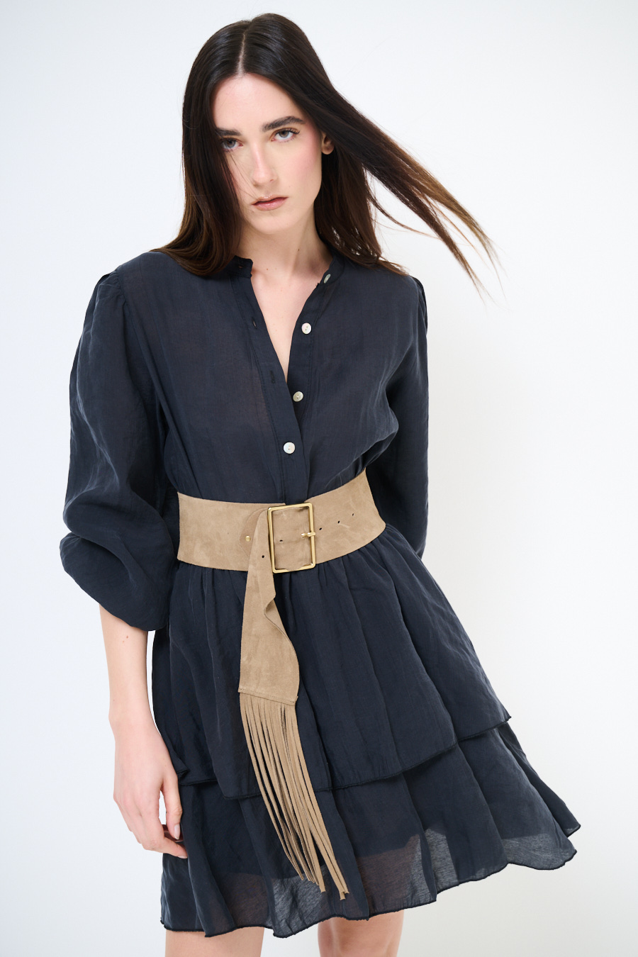 Short dress with flounce at the bottom, central buttoning up to the waist, with belt, mandarin collar and long sleeves with elastic at the wrist