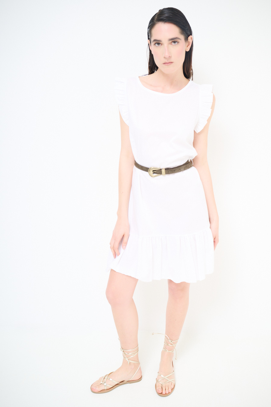Short dress in light poplin with stripes, flounce at the bottom and flap with ruffles on the shoulders, with central buttoning and rope belt at the waist