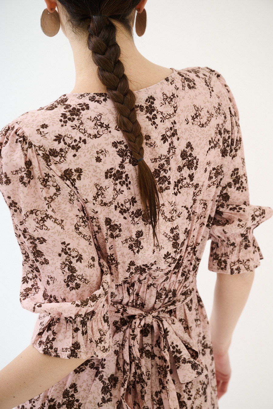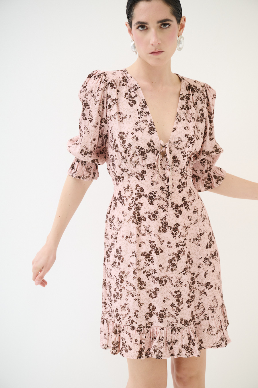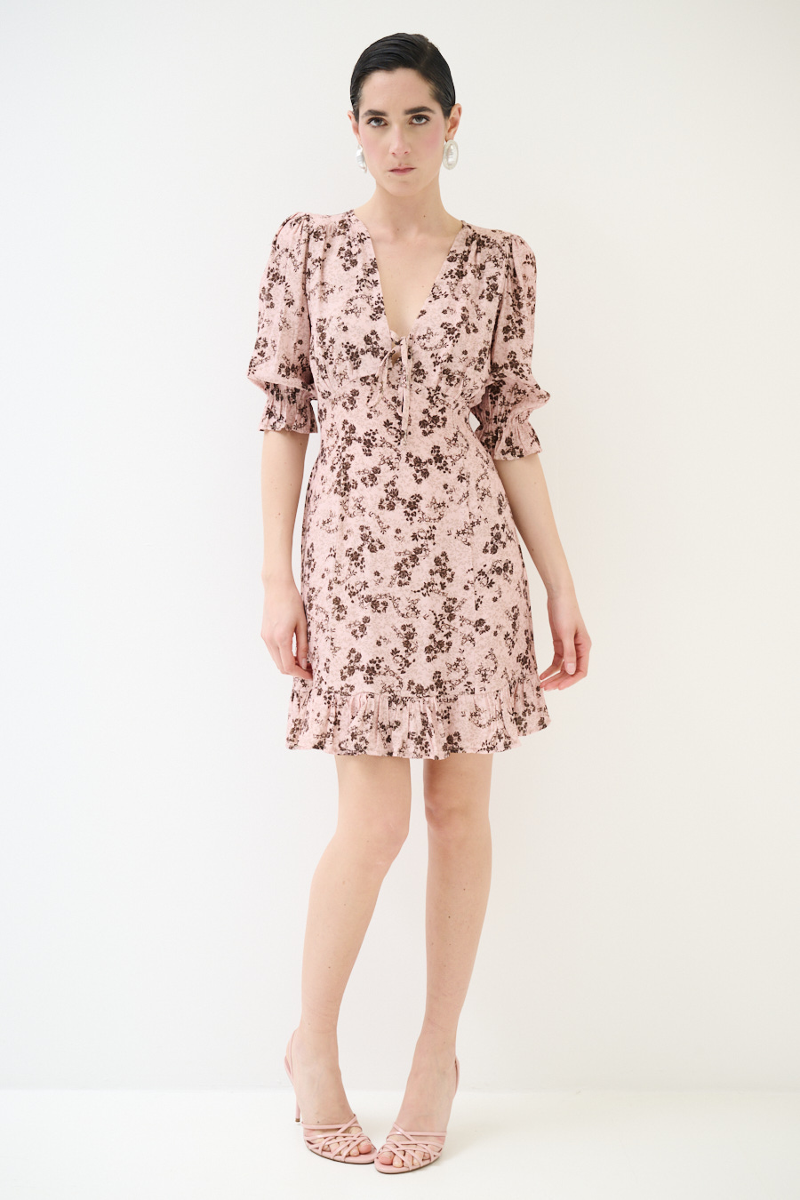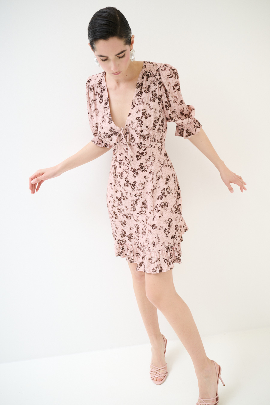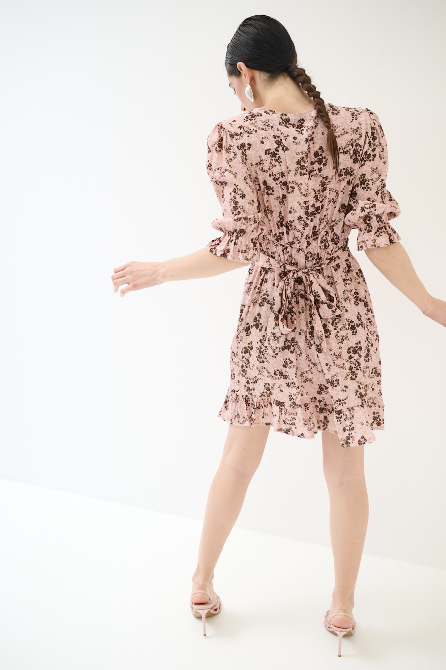 Short floral printed dress with wide V-neck, short gathered sleeve. Tied at the back with belt and ruffled hem