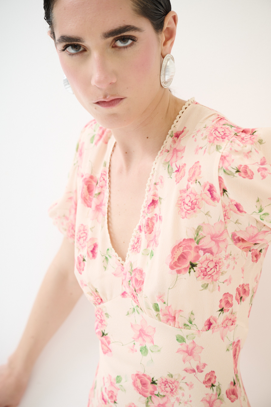 Abito lungo a fantasia floreale con scollo a v e manica corta con elastico, con inserto in passamaneria sullo scollo