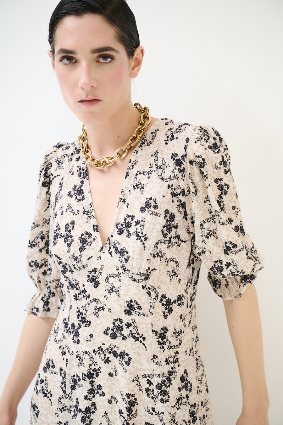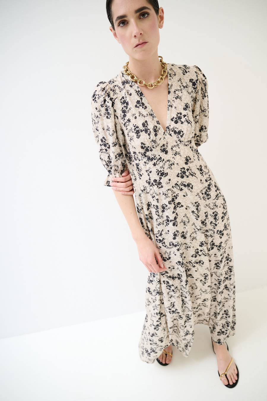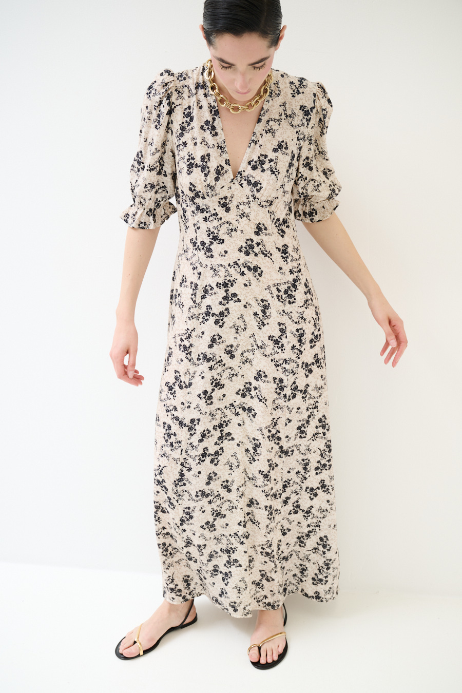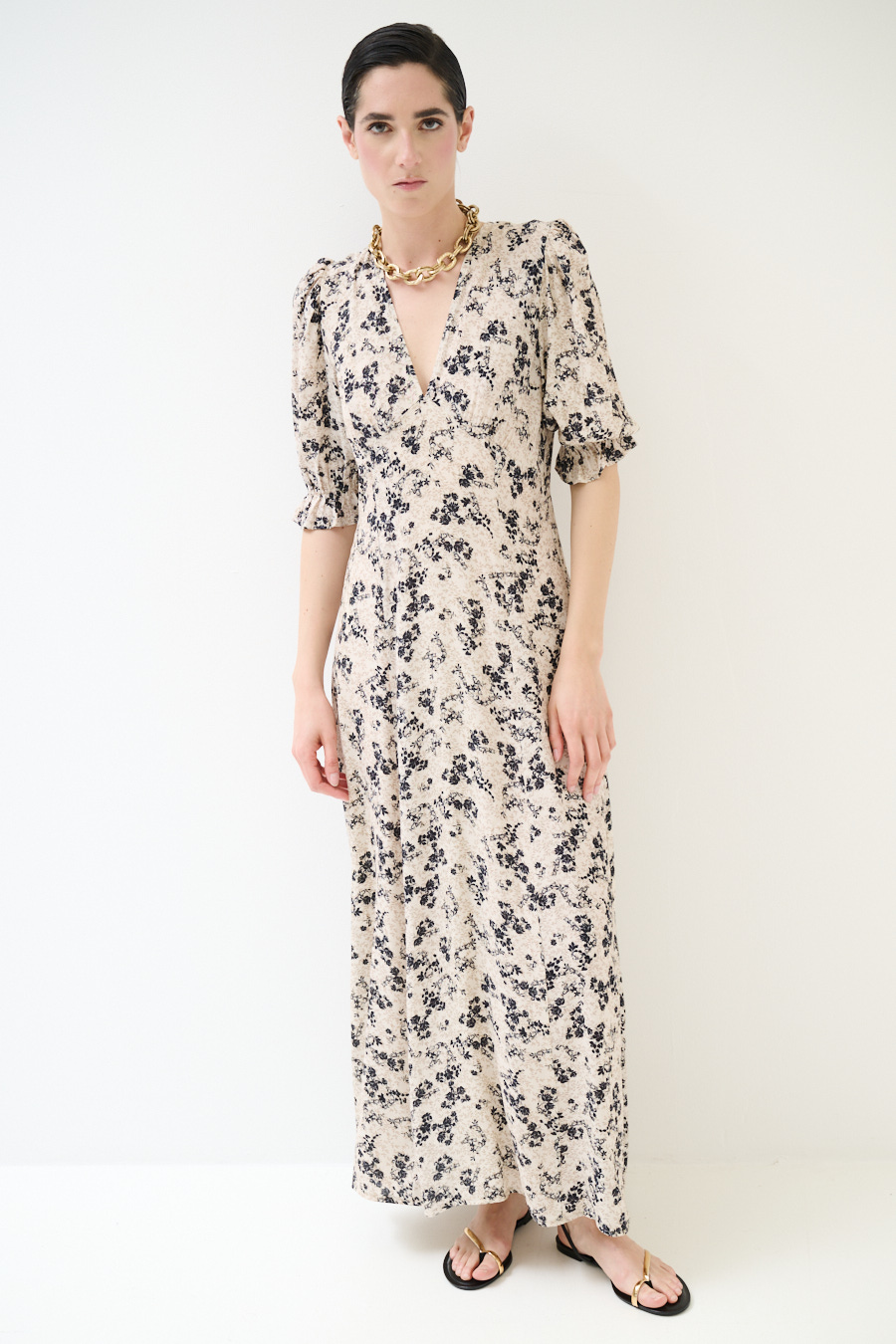 Long viscose floral print dress with short sleeve, V-neck and front ruching with back zip closure