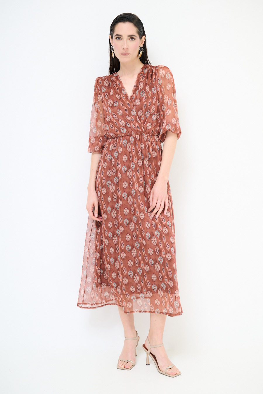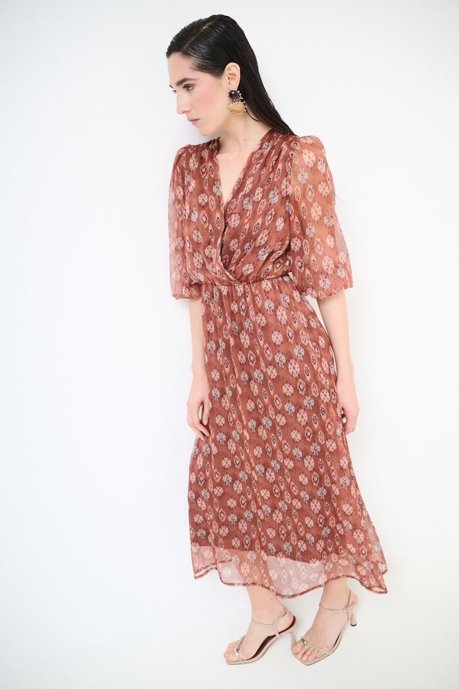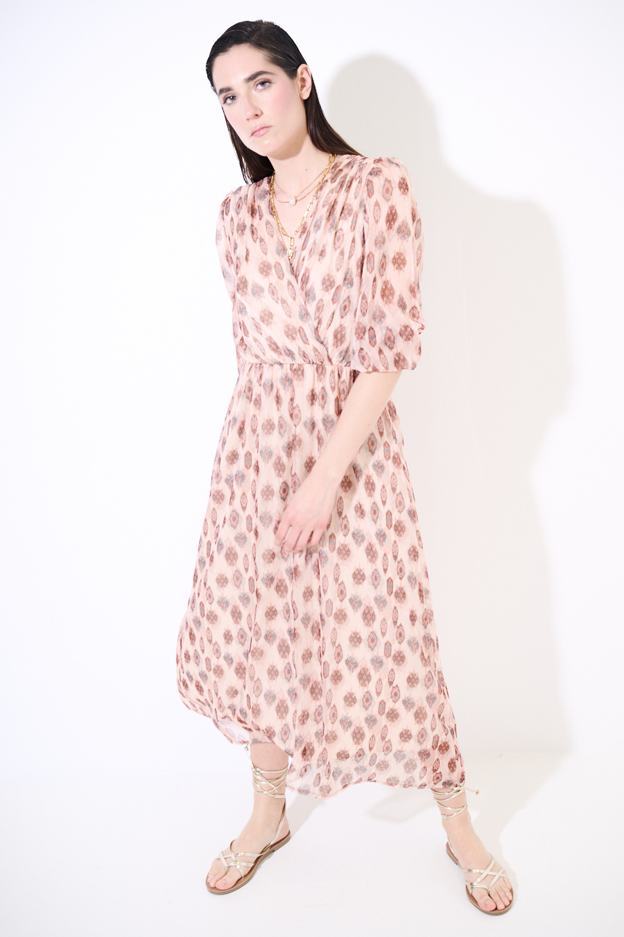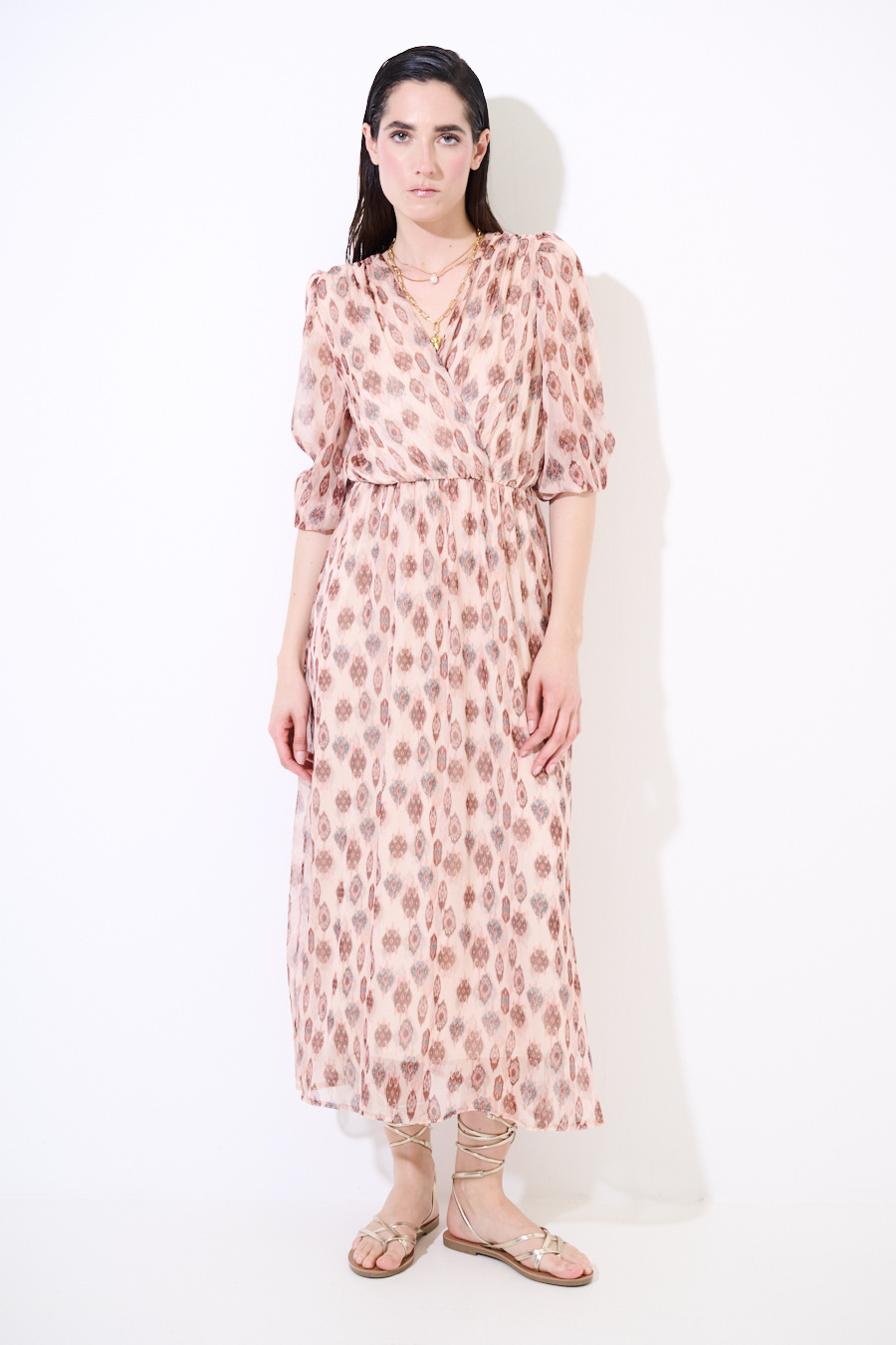 Abito lungo a fantasia con sottoveste, con manica a 3/4 con elastico e ampio scollo a v ripreso in vita