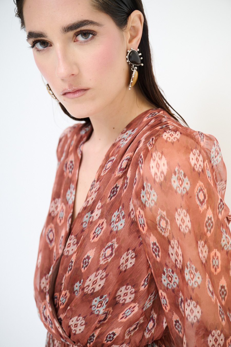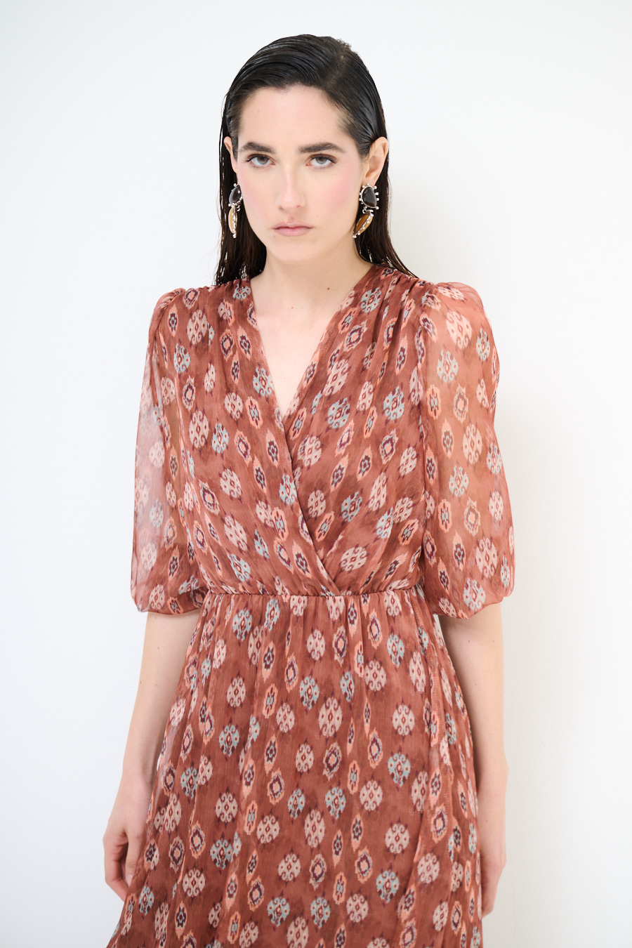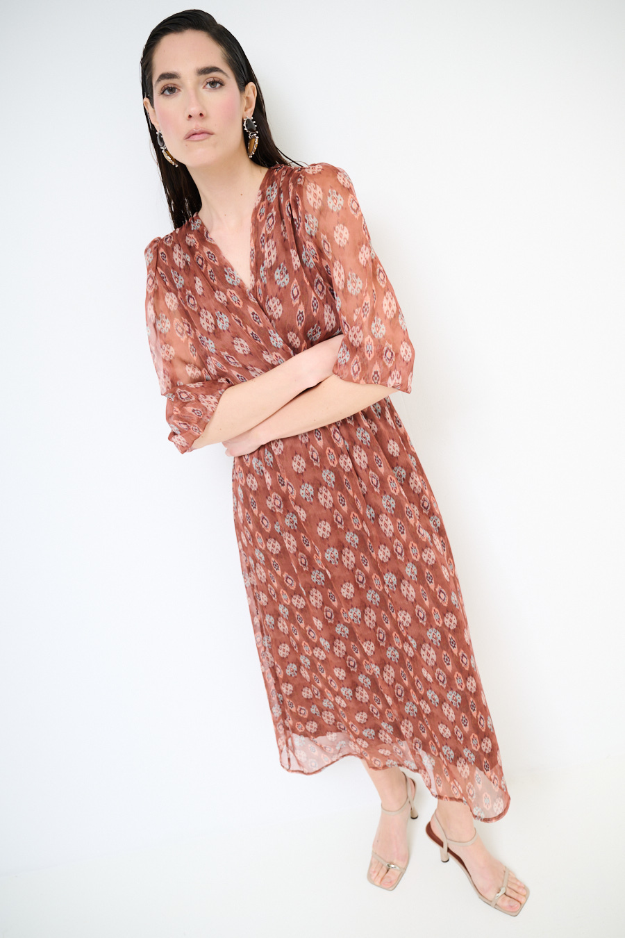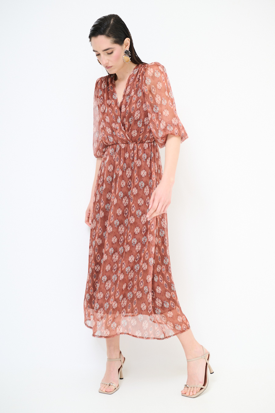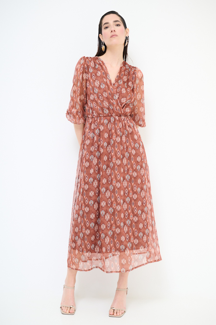 Abito lungo a fantasia con sottoveste, con manica a 3/4 con elastico e ampio scollo a v ripreso in vita