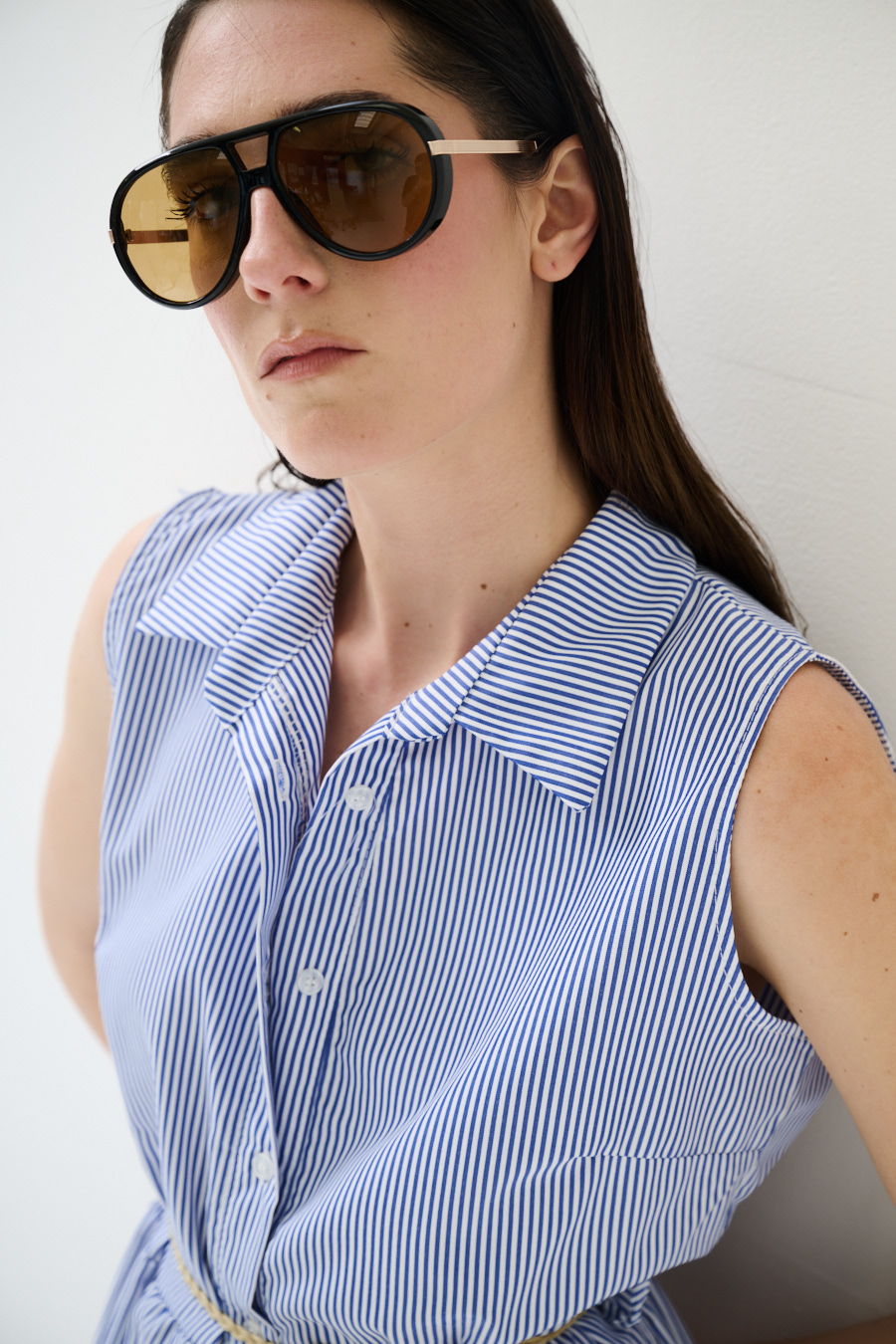 Long sleeveless striped shirt dress with flounces, central button fastening and rope belt at the waist
