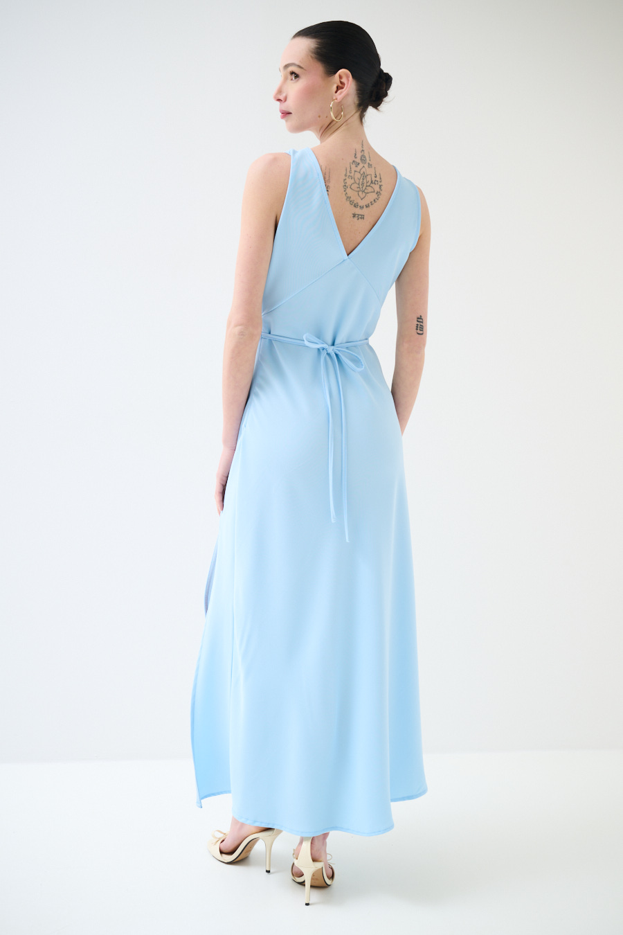 Sleeveless long dress in fluid fabric with V-neck, wide side slit and tie at the back