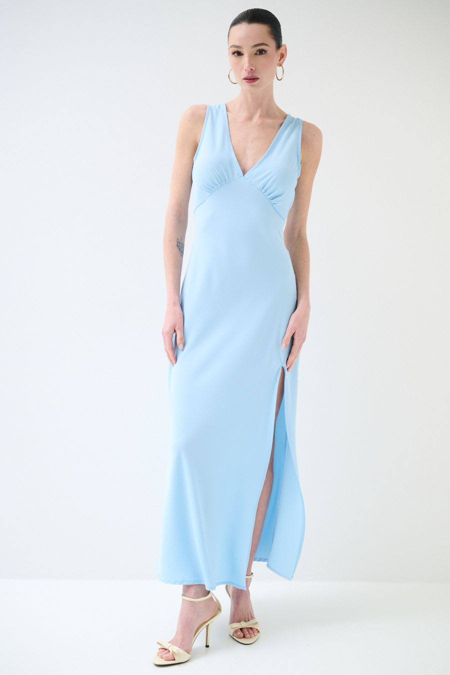 ABITO LUNGO SMANICATO CON SPACCO TESSUTO FLUIDO CELESTE