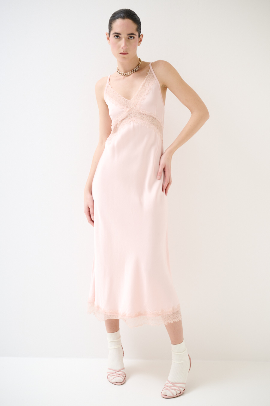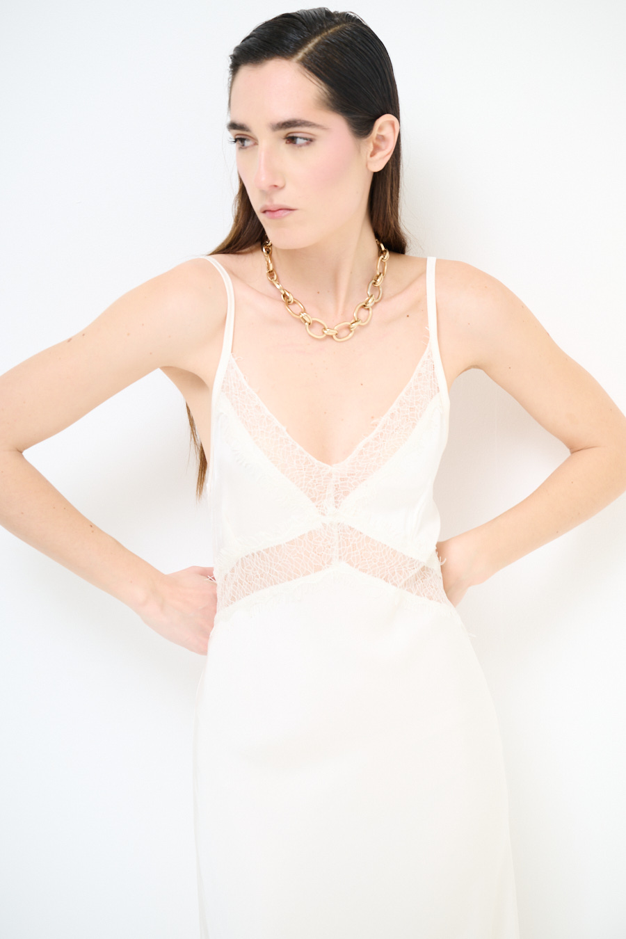 Long satin dress with lace inserts on the V-neck and under the décolletage and hem. With thin adjustable straps