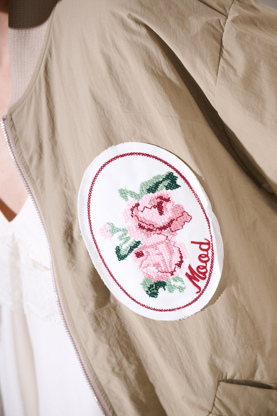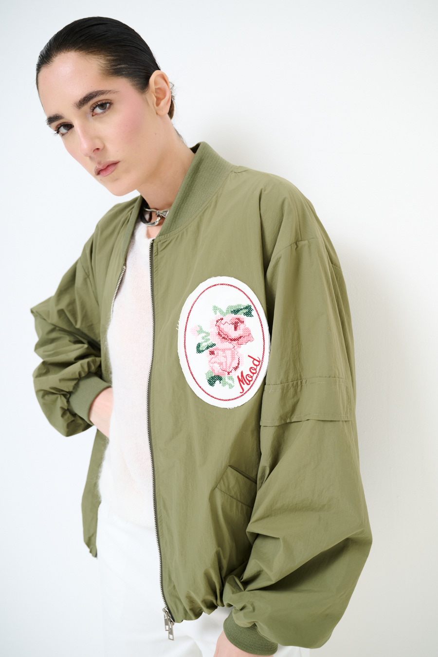 Oversized bomber jacket with front patch, two-way zip closure, gathered hem and mesh inner lining